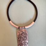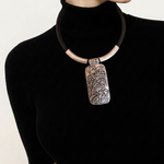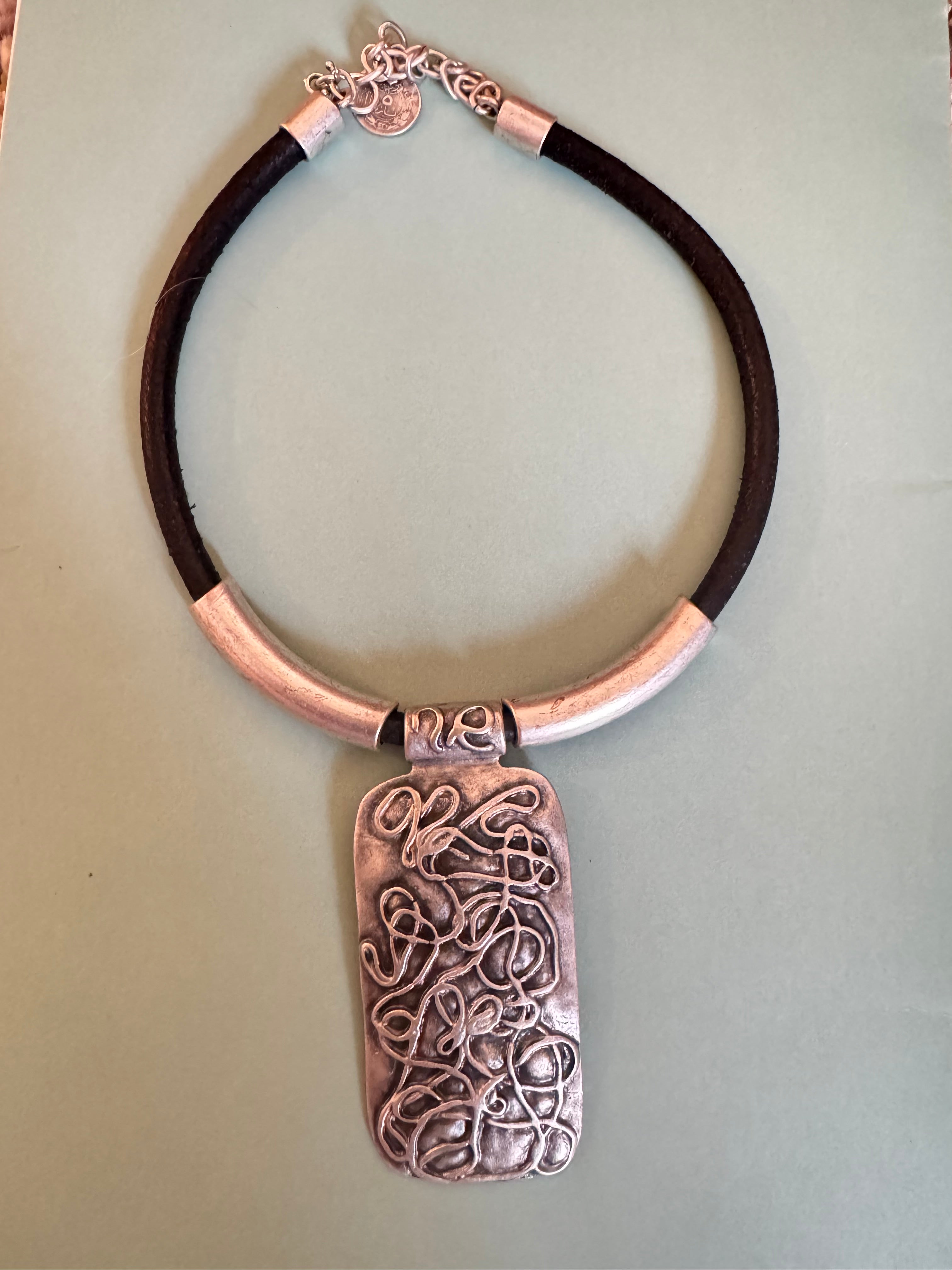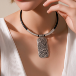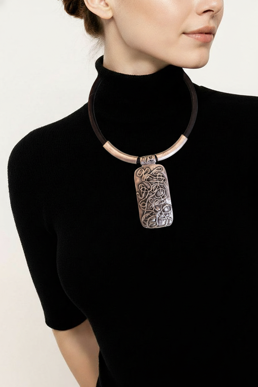This necklace isn’t just jewelry—it’s a mood. Featuring a chunky black band and a rectangular pendant with swirling, sculptural vibes, it’s giving “I’m the art and the artist.” The raised abstract design adds texture and intrigue, while the silver accents keep it sleek and edgy. Perfect for those days when you want your accessories to speak louder than words. Pair it with a turtleneck, a power pose, and a little sass—because subtle is overrated.