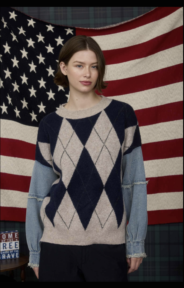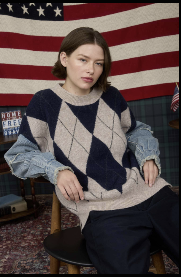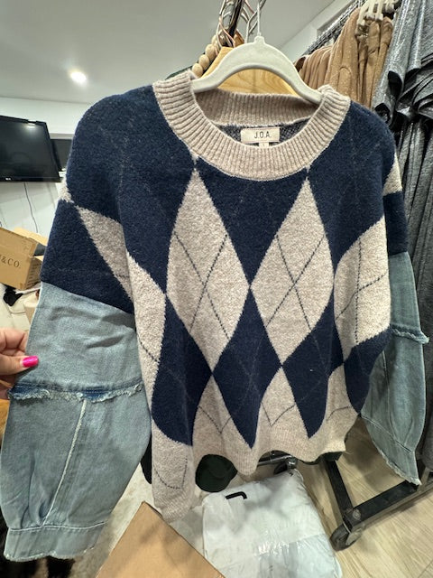 ARGYLE DISTRESSED DENIM SLEEVE KNIT SWEATER
