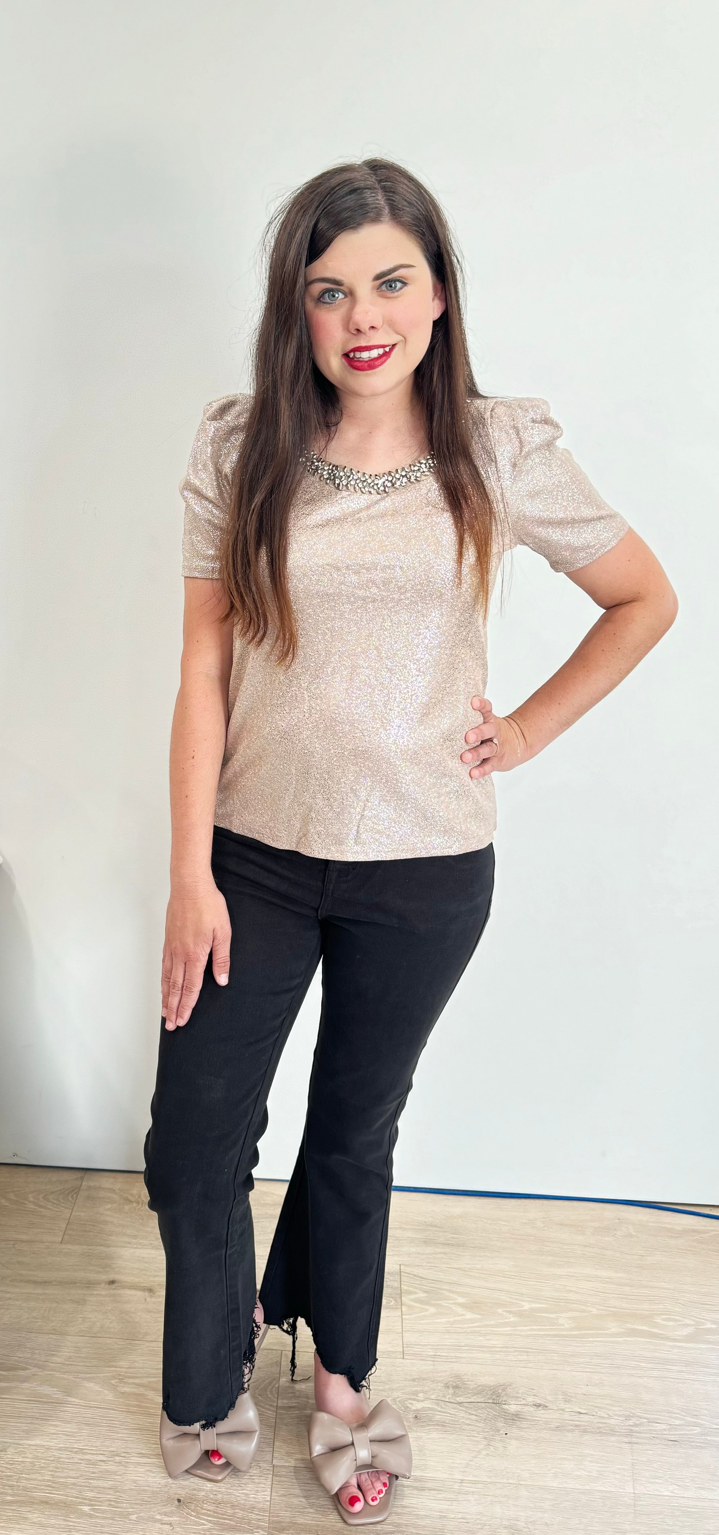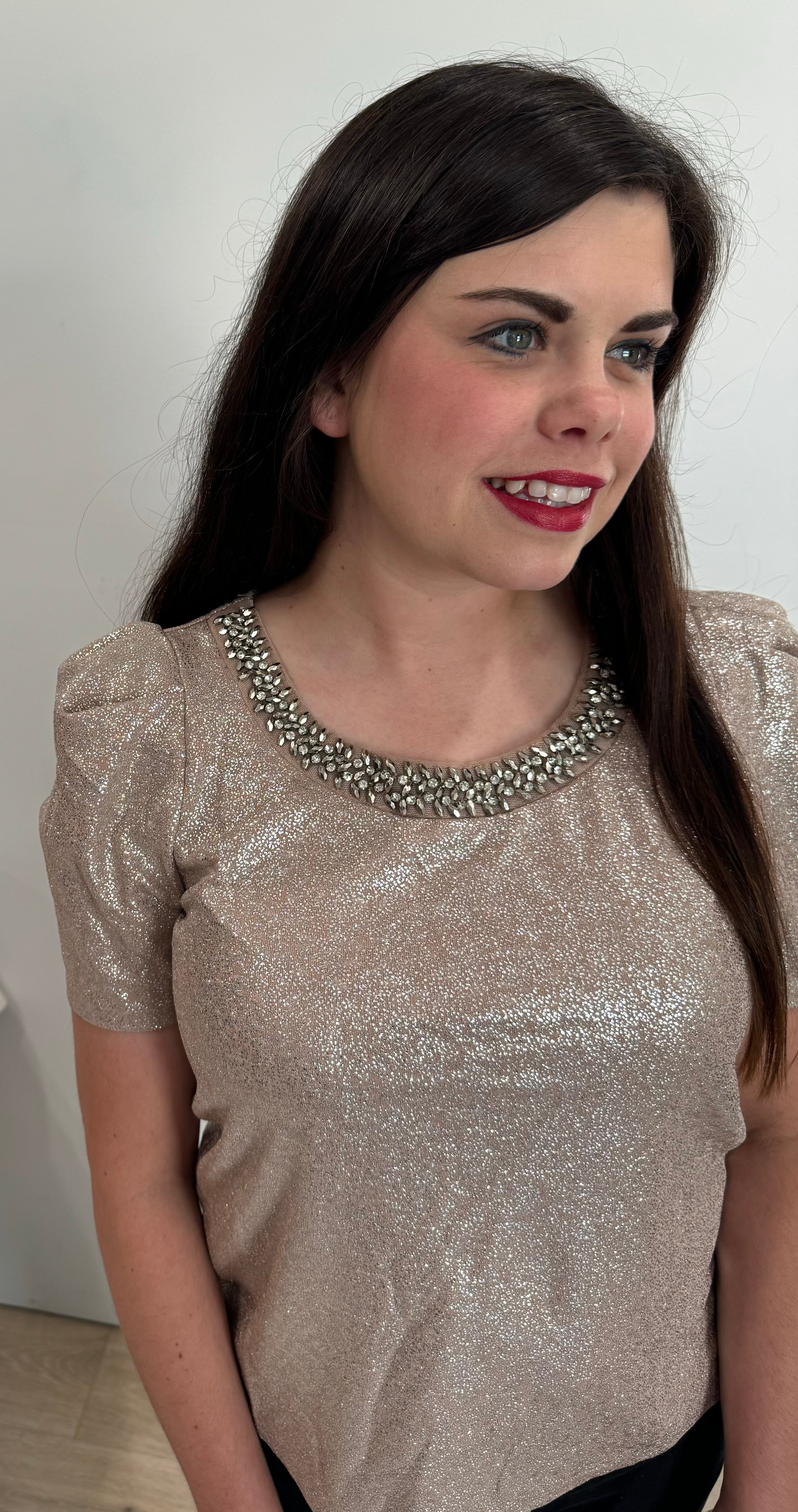 Indulge in luxury with Be Jeweled, a dazzling top featuring a bejeweled round collar and sparkling metallic gold fabric. The short pleated sleeves add volume while the padding ensures a flawless silhouette. Stand out from the crowd with this exclusive and elegant piece.