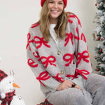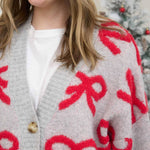Elevate your cozy game with this charming bow pattern knit cardigan! Featuring a flattering V neckline and relaxed oversized silhouette, it's perfect for effortless layering. The extended drop shoulders and long sleeves create an on-trend, comfortable fit that works with everything in your closet. Adorned with a delicate jacquard bow pattern throughout, this button-down sweater adds a touch of whimsy to your everyday style. Slip it on for instant polish and personality.