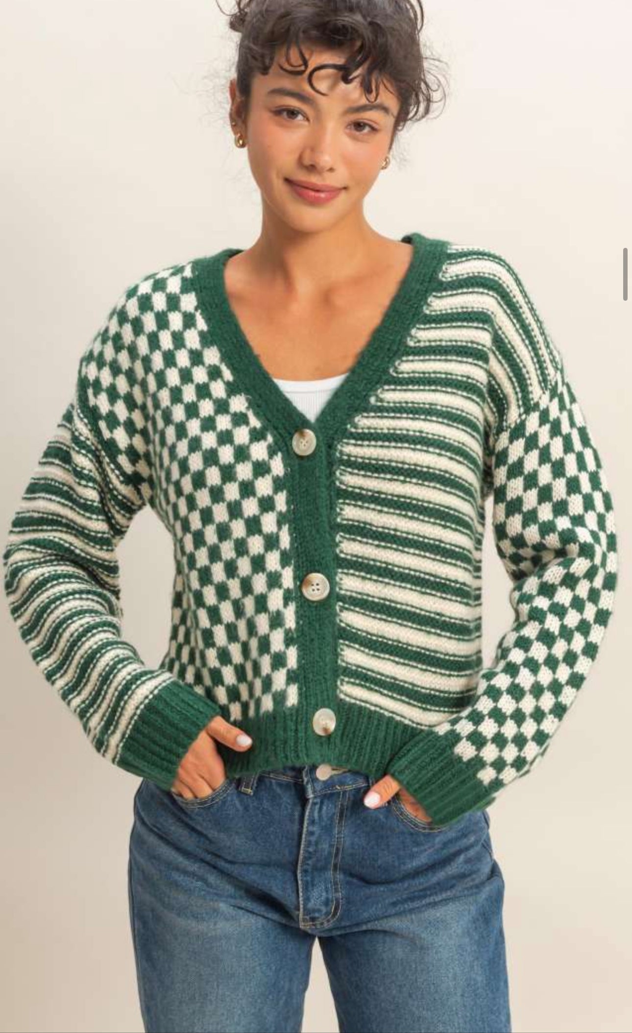 Wrap yourself in cozy charm with the Check it Out Sweater, featuring a playful green and white large check pattern. This button-up cardigan, trimmed in solid green, adds a fun pop of color and texture to any outfit. Its waist-length cut keeps things cute and comfy, perfect for layering on cooler days. Whether casual or chic, this sweater is ready to brighten up your look!