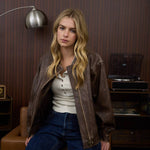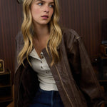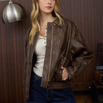 COLLARED ZIP-UP WASHED FAUX LEATHER JACKET