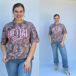 This playful camo short sleeve shirt brings a fun twist to classic country style. Featuring the phrase "Country Babe" topped with a charming pink puff ink bow, it adds a flirty and unique touch to your casual look. Perfect for standing out while keeping it comfy and cool.