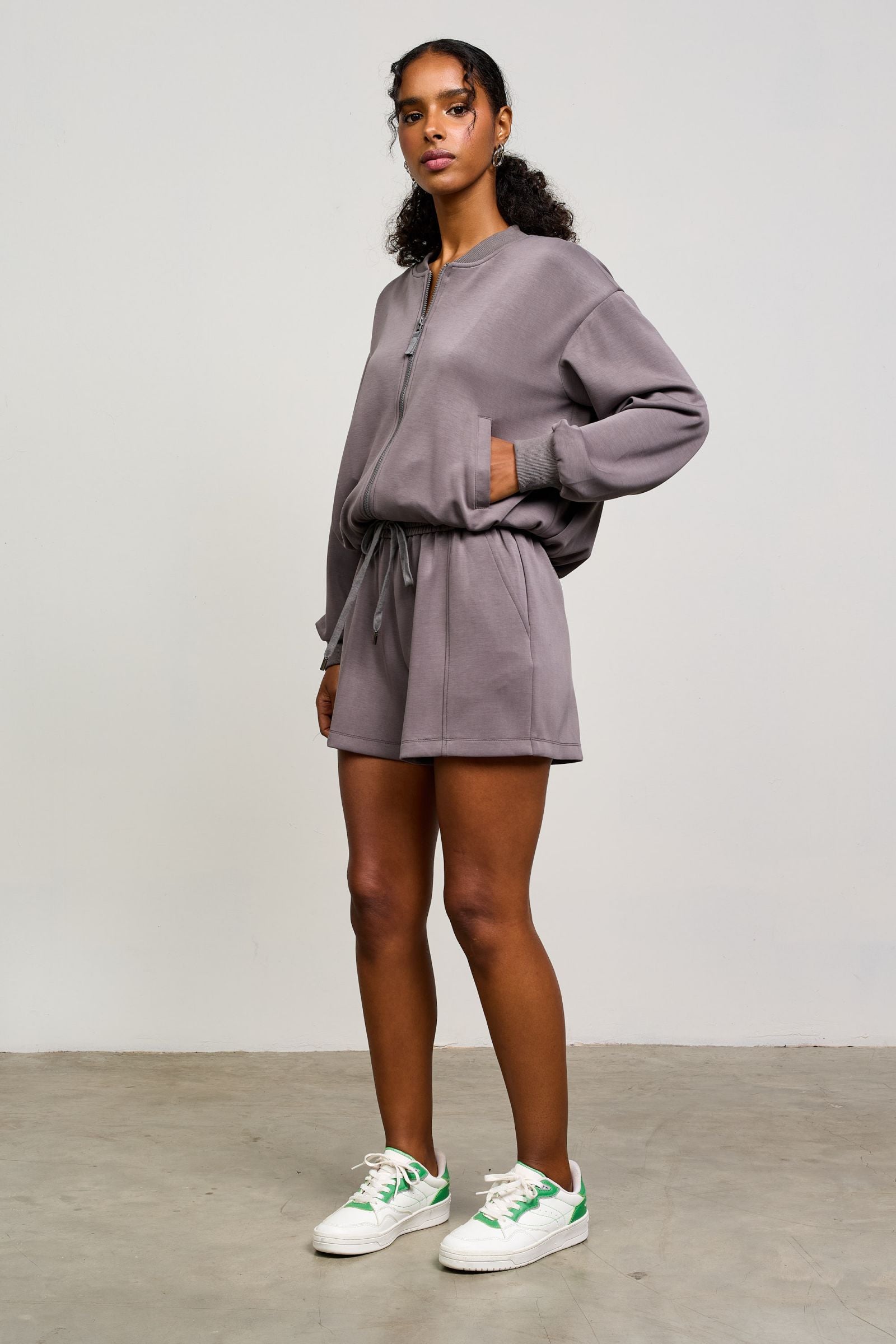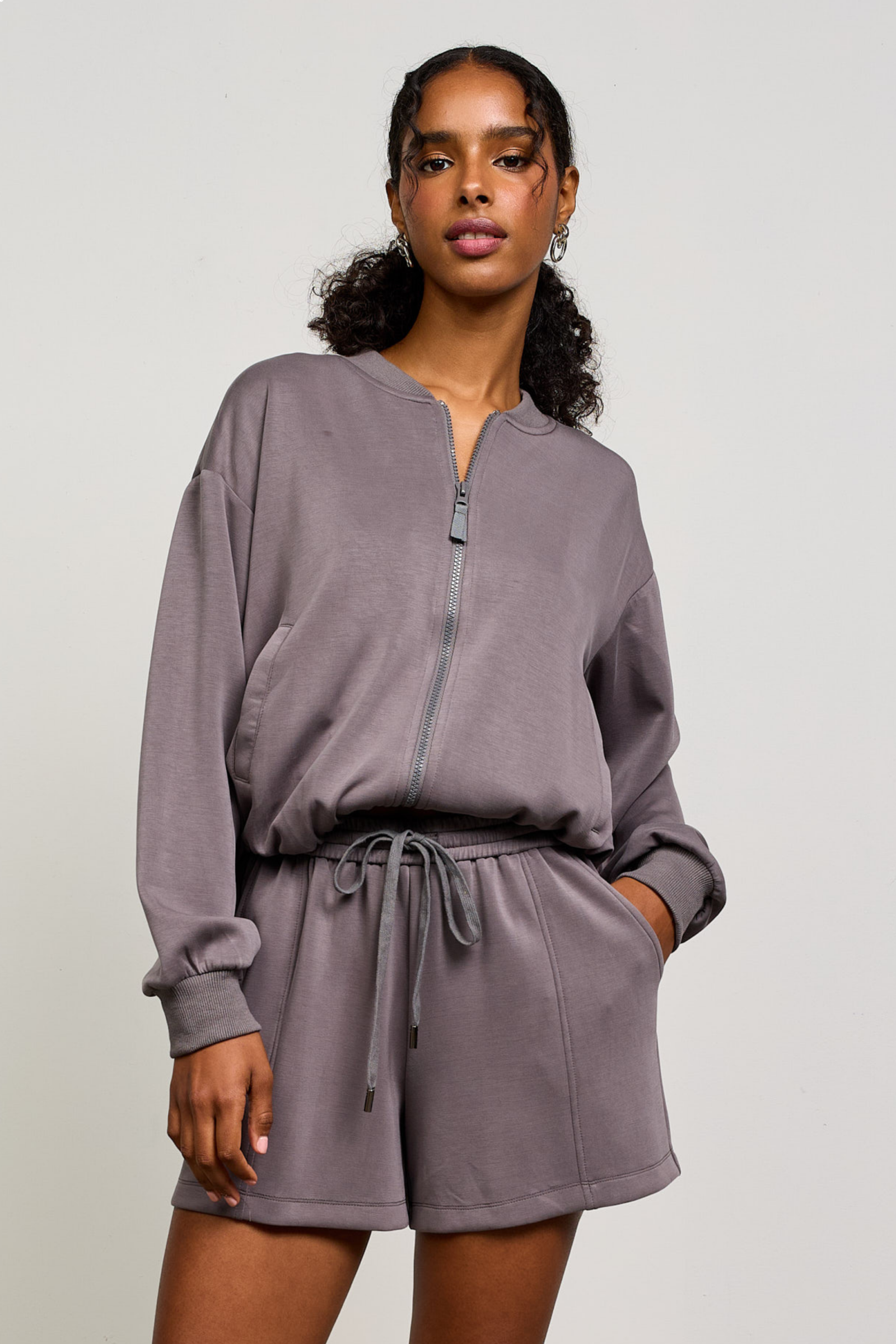 - This bomber jacket is made from soft modal material, making it the perfect jacket to cuddle up in. It features a convenient zip front and side pockets for storage, as well as an elastic waist and ribbed collar for added style. Stay cozy and stylish with this soft zip jacket.