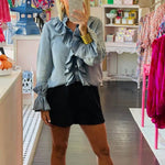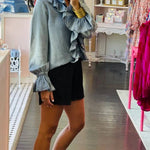 This playful long sleeve top pairs soft denim with charming ruffled details down the front and on the sleeves. Made from 100% Tencel, it offers a lightweight, breathable feel perfect for all-day comfort. The button-down design adds a classic touch while the ruffles bring a fun, feminine flair to your casual wardrobe.