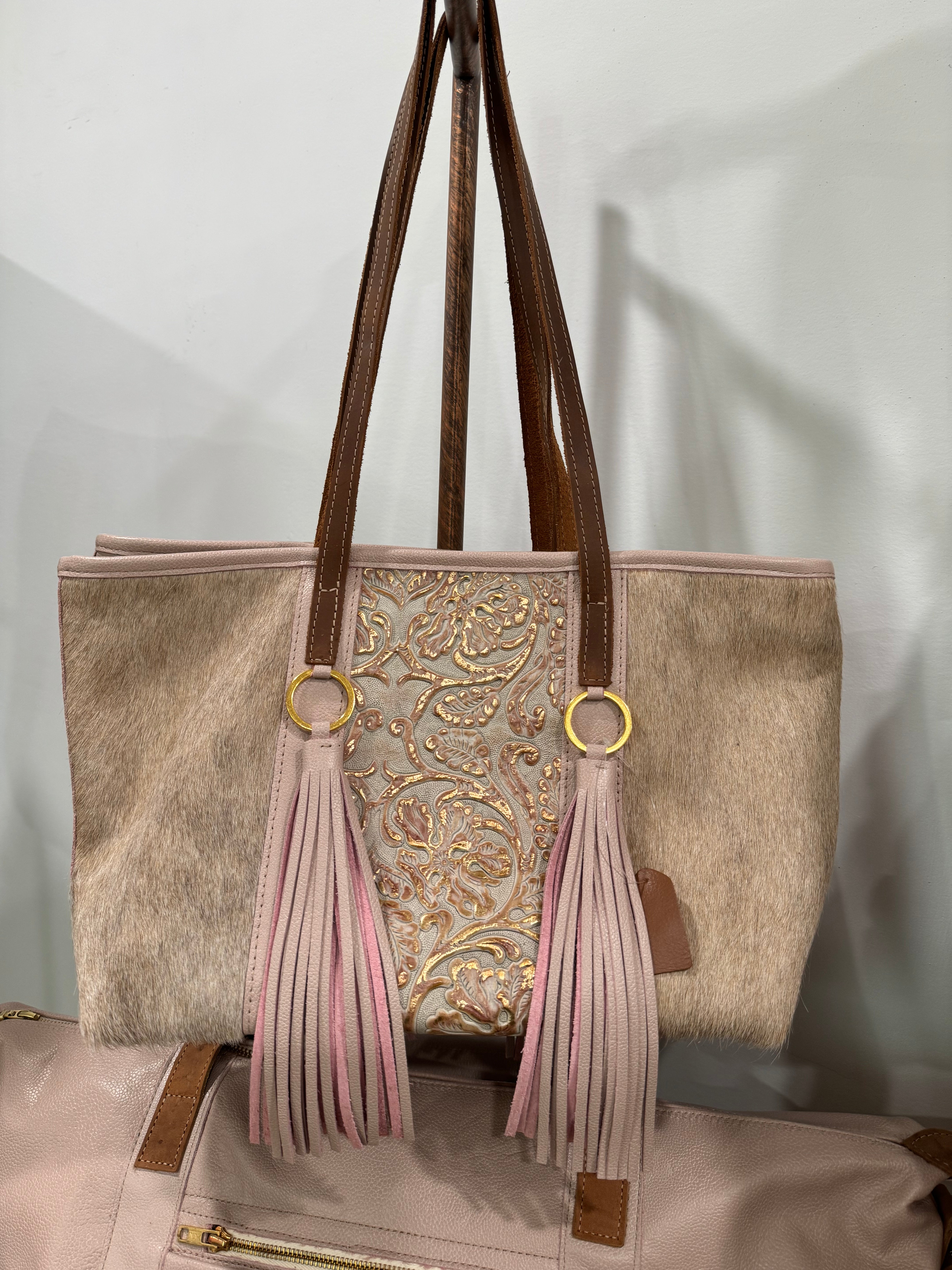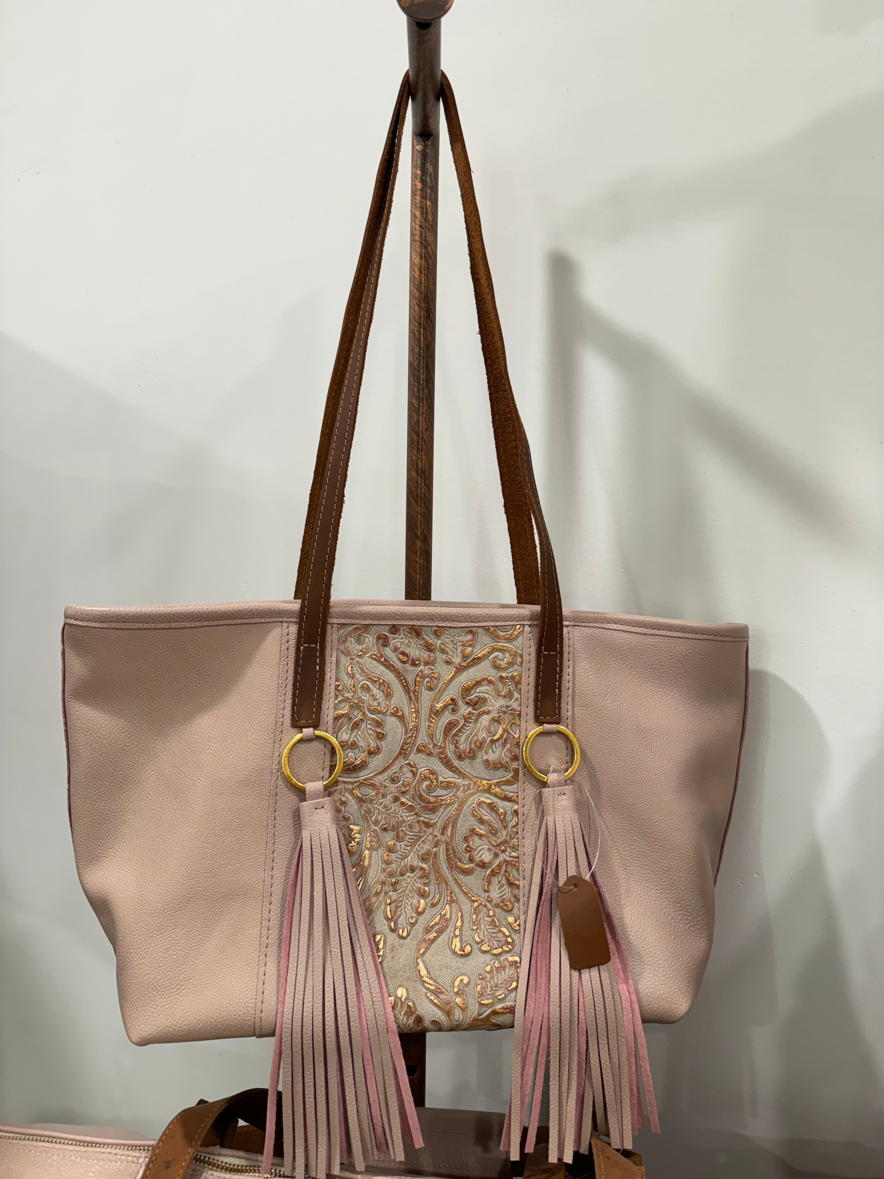 Description: Elevate your style with this stunning horizontal rectangular leather bag in a soft blush color. Featuring a strip of tool leather down the center, this bag exudes a bohemian vibe with its fringe detailing on front hardware. The double shoulder strap design allows you to wear it comfortably. Complete with a convenient pocket on the outside, this bag combines fashion and functionality in one chic accessory.