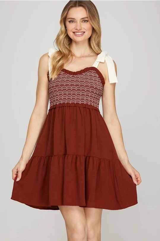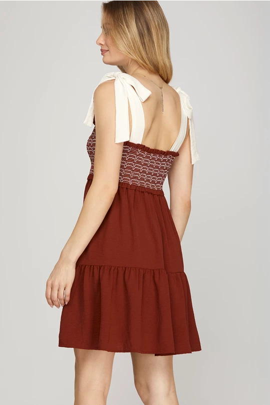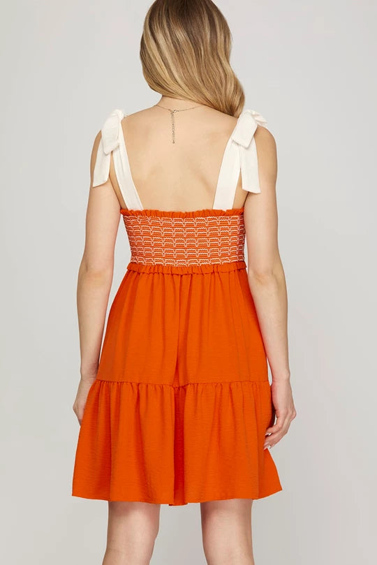 "Get ready to score a fashion touchdown with our Game Day mini dress! Perfect for tailgates and game day parties, this shoulder bow tie smocked dress will have you looking stylish while cheering on your team. With a tiered design and comfortable woven fabric, you'll be the MVP of any event.