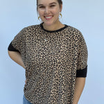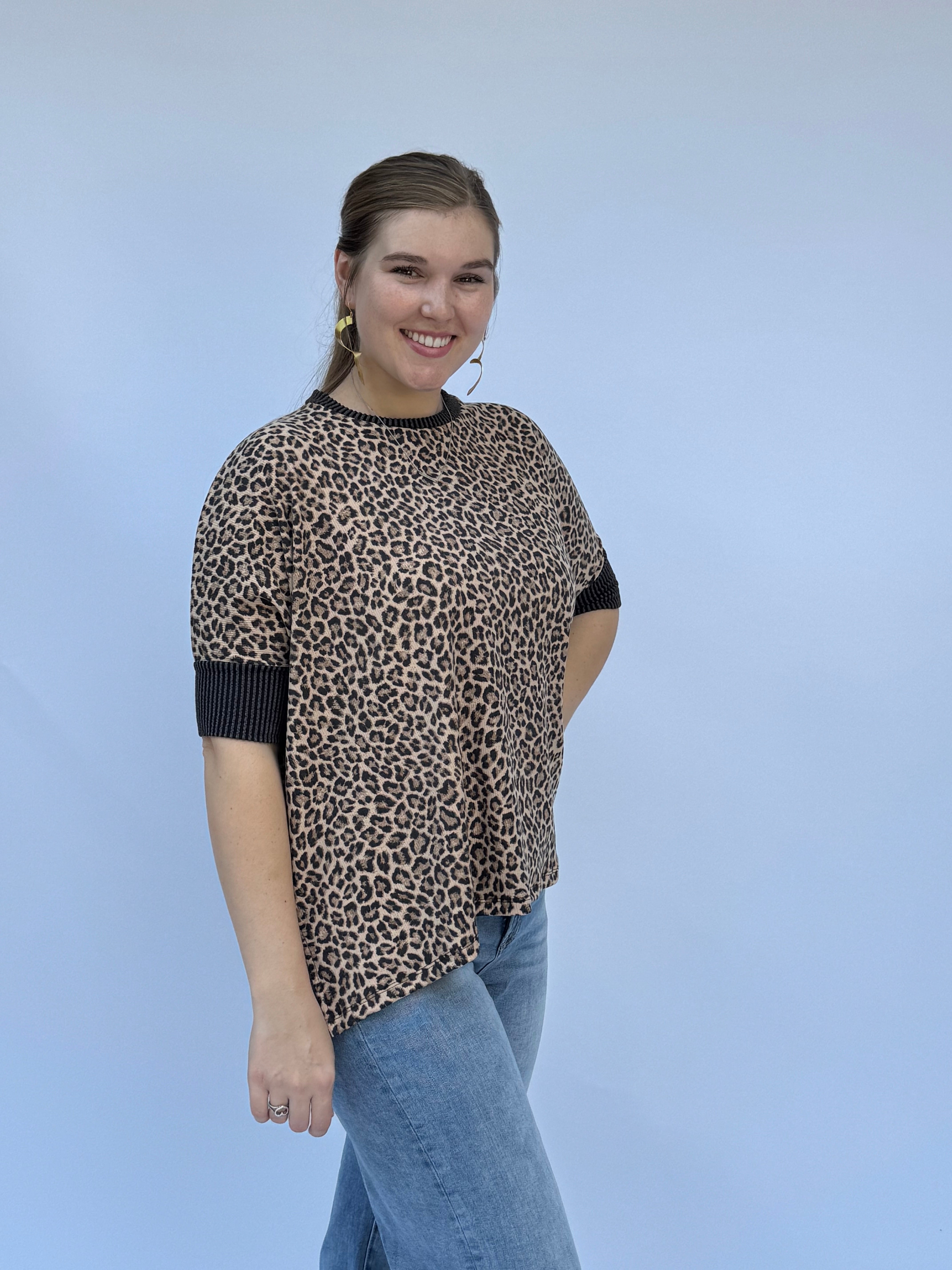 Get wild with our three-quarter sleeve leopard print top! Featuring a scoop neck and ribbed trim, this top adds a playful accent to any outfit. Don't miss out on this unique pop of color in cream, black, and brown.