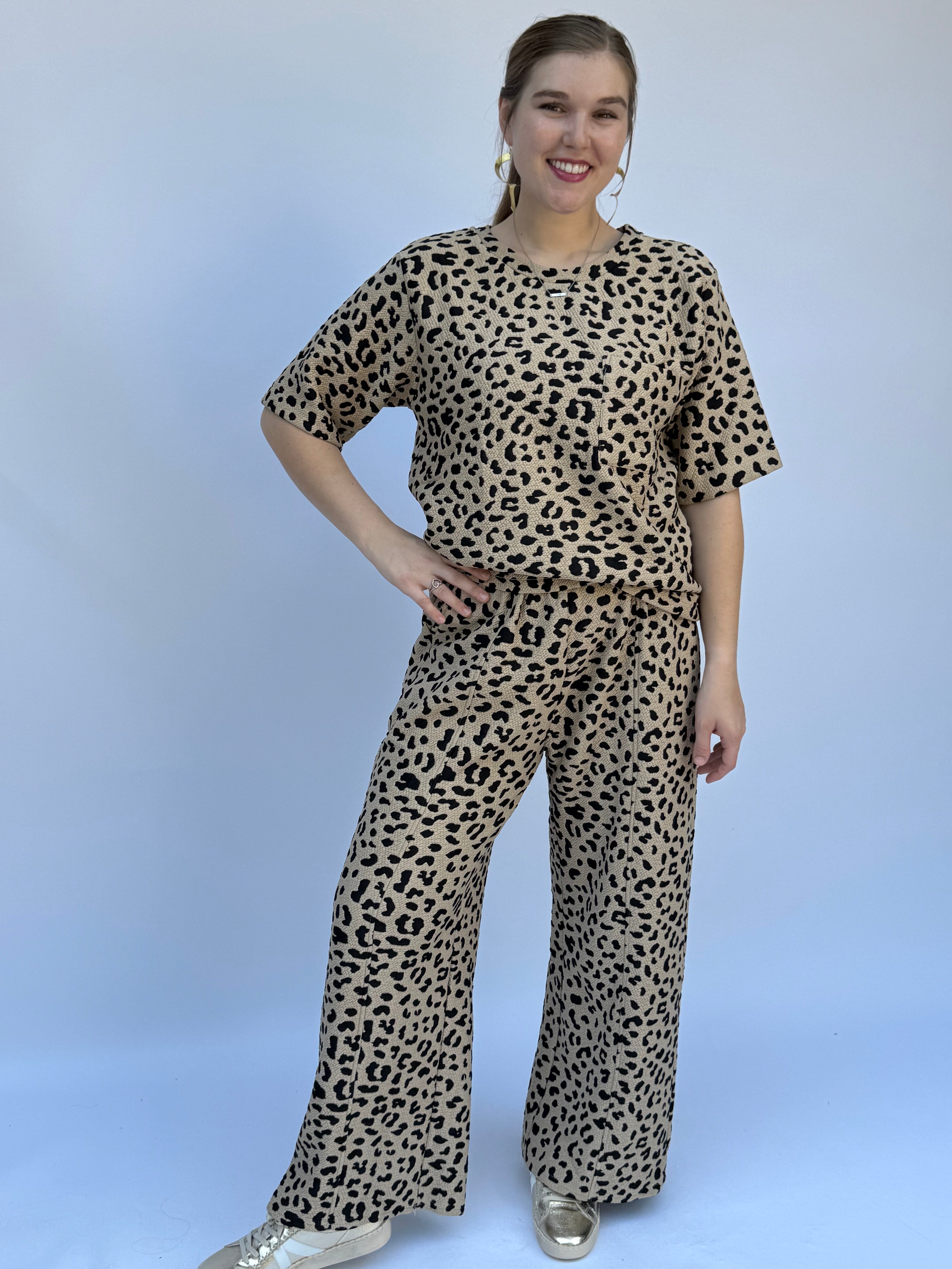 Turn heads and unleash your wild side with this half sleeve textured knit leopard print top. The playful pattern and cozy fabric make it perfect for adding a fun, fierce touch to your everyday look. Lightweight yet textured, it keeps you comfortable while standing out in style. Perfect for casual outings or pairing with bold accessories to showcase your confident spirit.