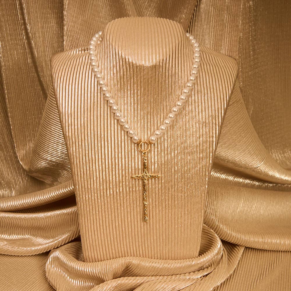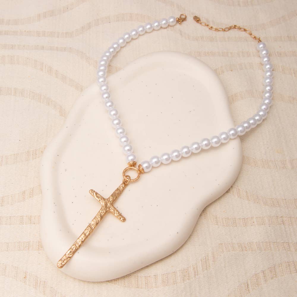 Hammered Cross Pendant Pearl Necklace