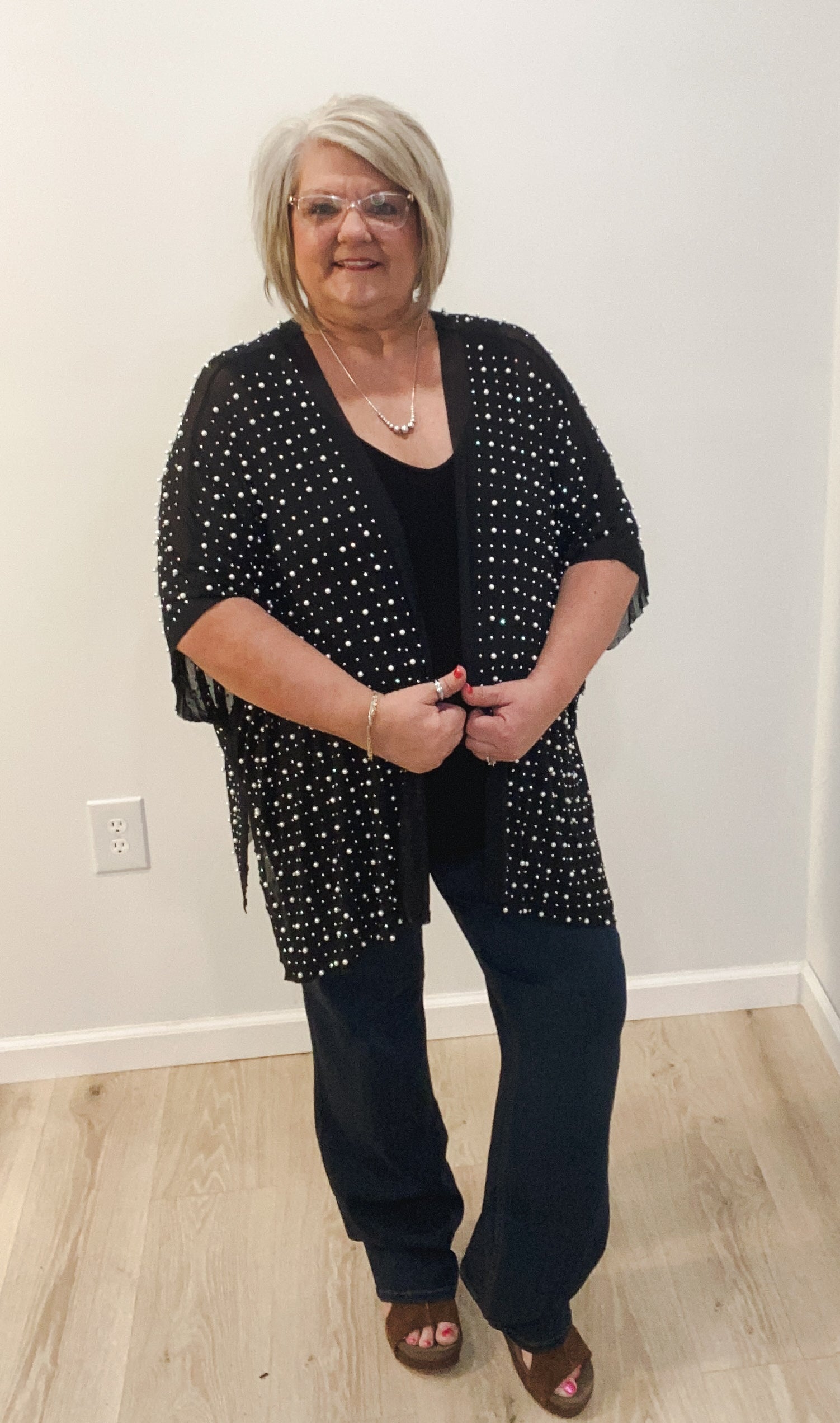Jules embodies timeless sophistication. It's the perfect addition to your wardrobe, effortlessly enhancing your personal style and celebrating your impeccable taste. The versatile design of this mesh kimono allows for endless styling possibilities. Layer it over a simple cocktail dress or pair it with tailored pants and a blouse for a polished and sophisticated look. Alternatively, wear it over a swimsuit for a glamorous beach cover-up that exudes confidence and glamour.