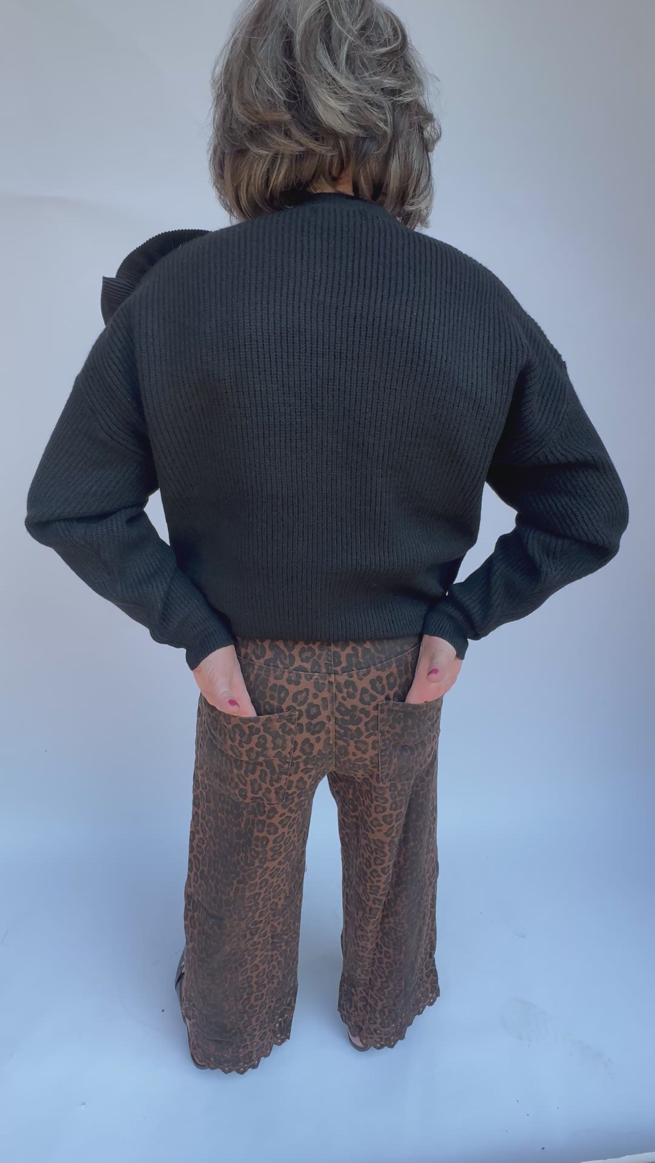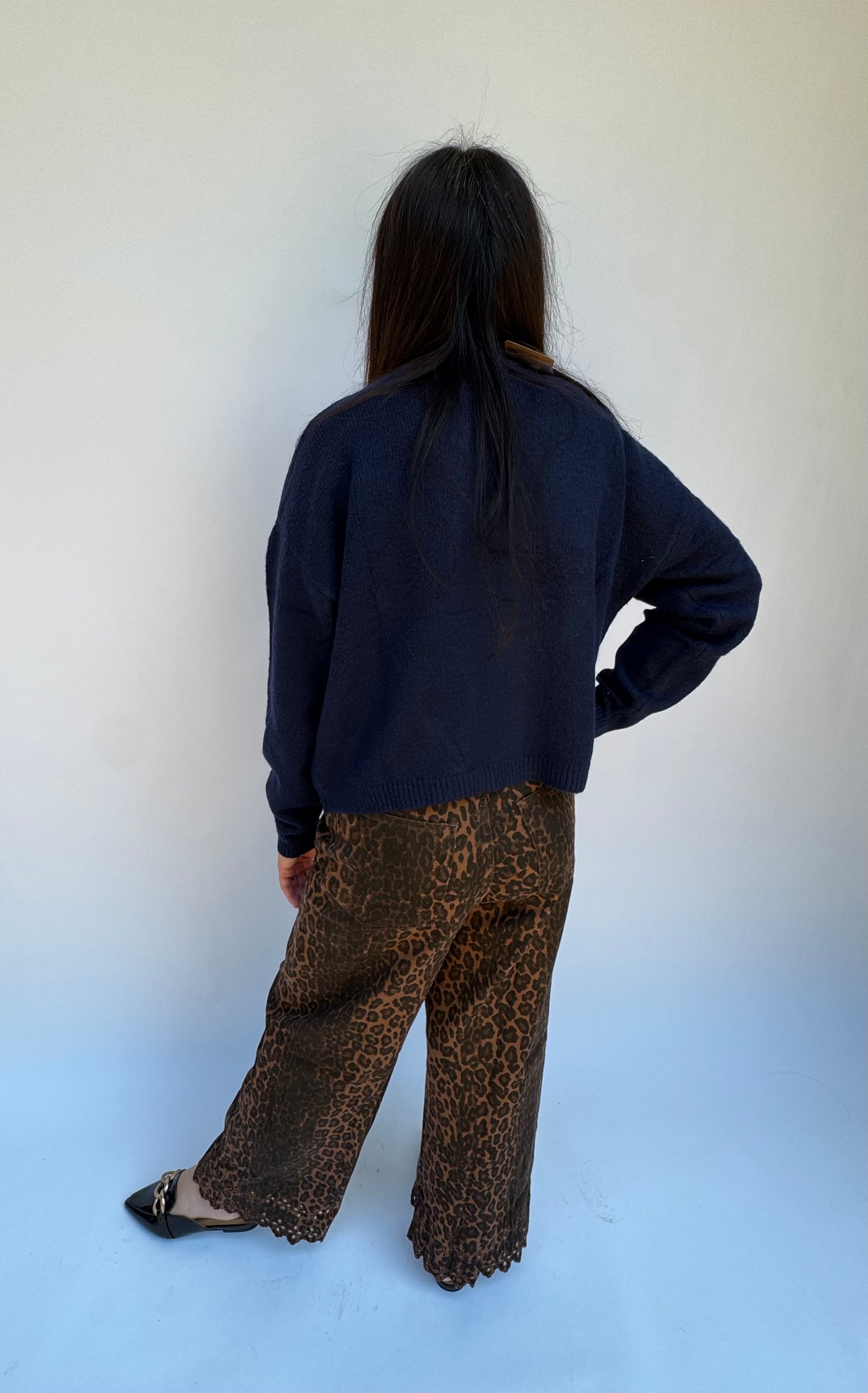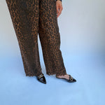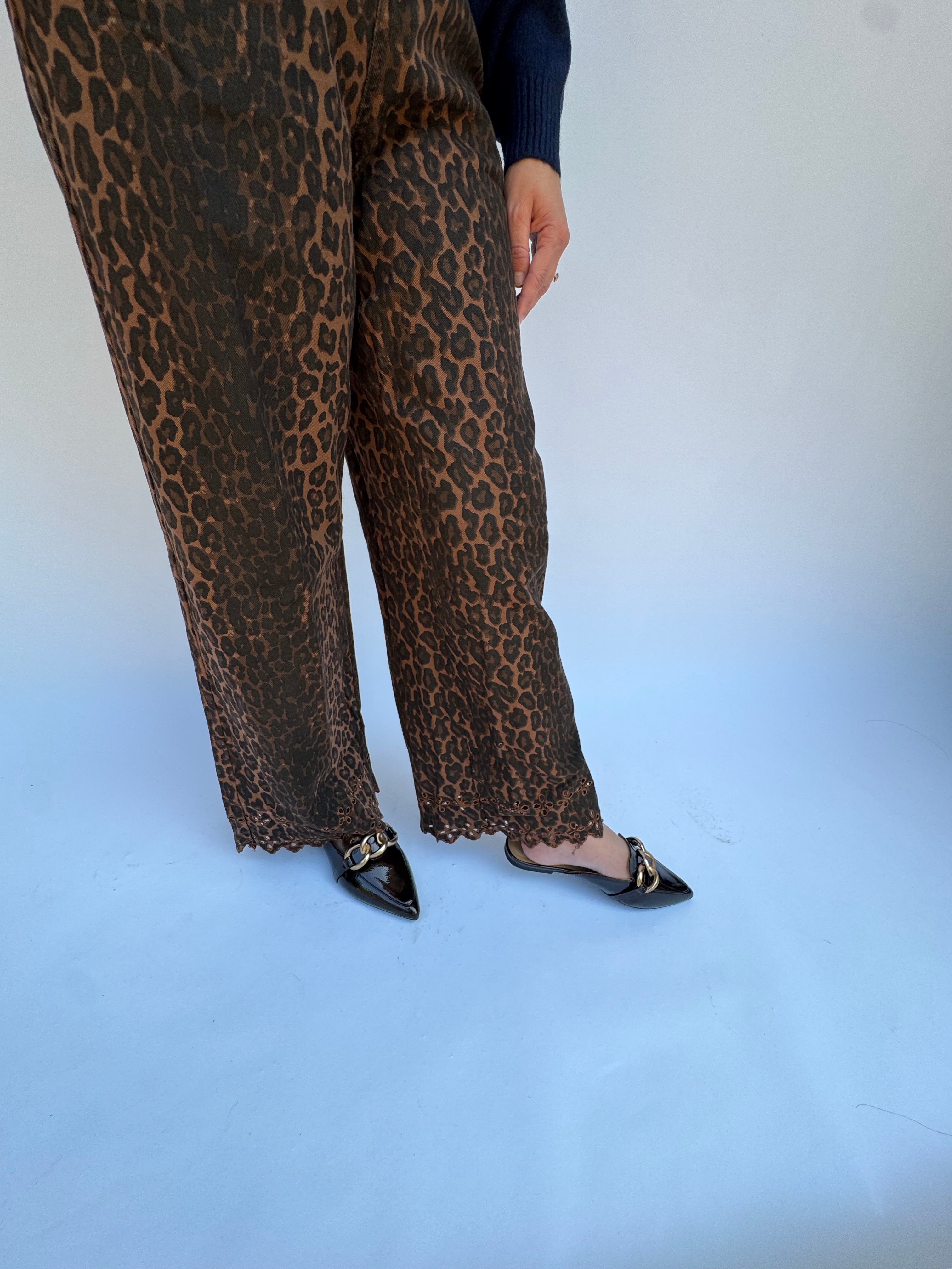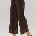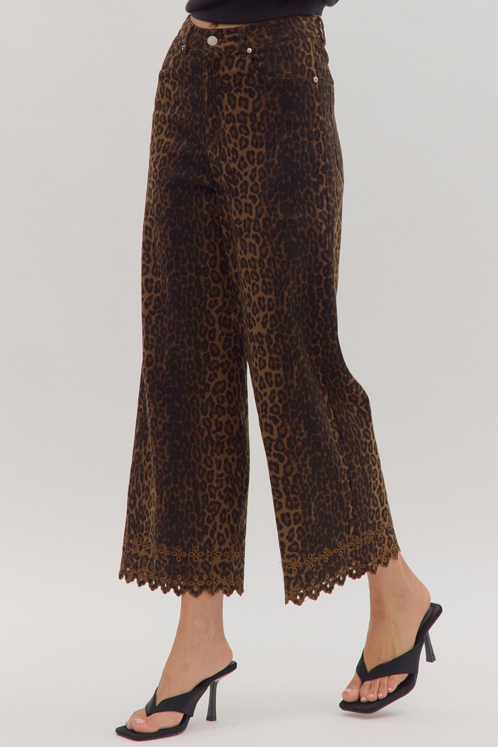 Bring a wild twist to your wardrobe with these playful leopard pattern pants, beautifully finished with delicate floral embroidery at the hem. The button zip-fly front and classic denim pockets add timeless charm while keeping the look fun and fresh. Perfect for those who love mixing bold prints with a touch of elegance.