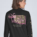 Celebrate your style and support with this black long sleeve shirt featuring a fun pink camo silhouette of Oklahoma. The playful pink ribbon and bold state abbreviation add a charming touch, perfect for showing your spirit in a unique and lively way. Comfortable and eye-catching, it’s a great pick for any casual day or special event.