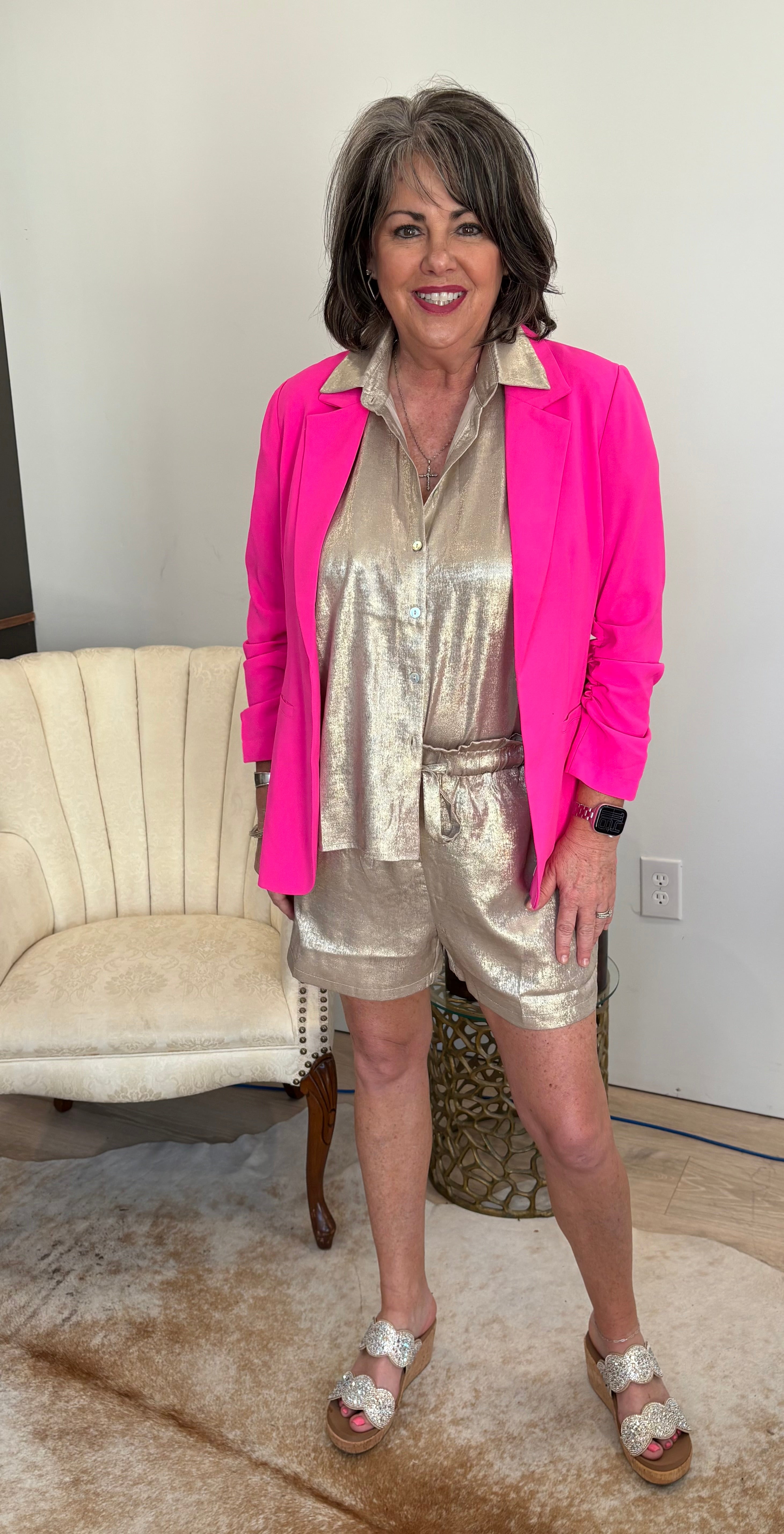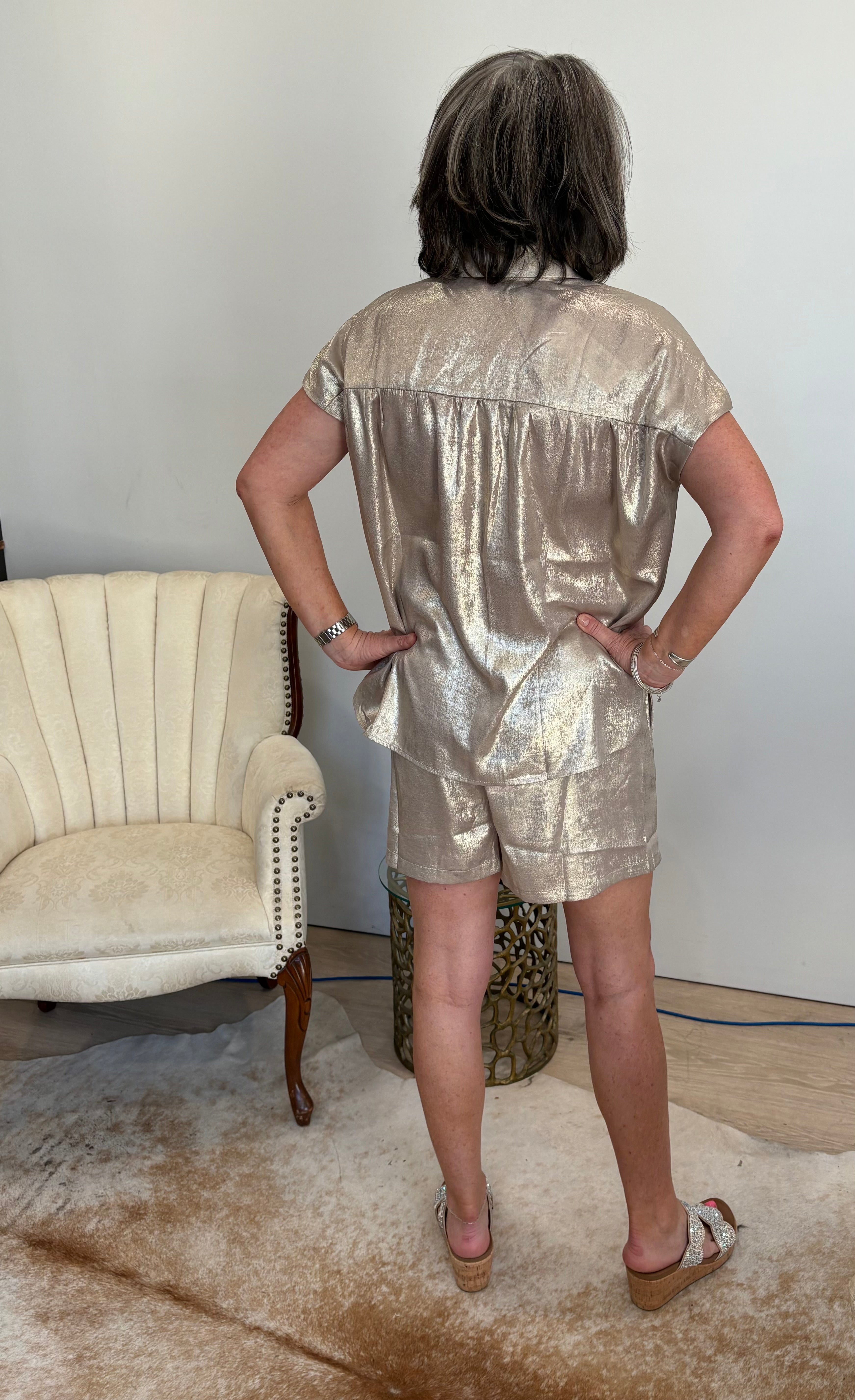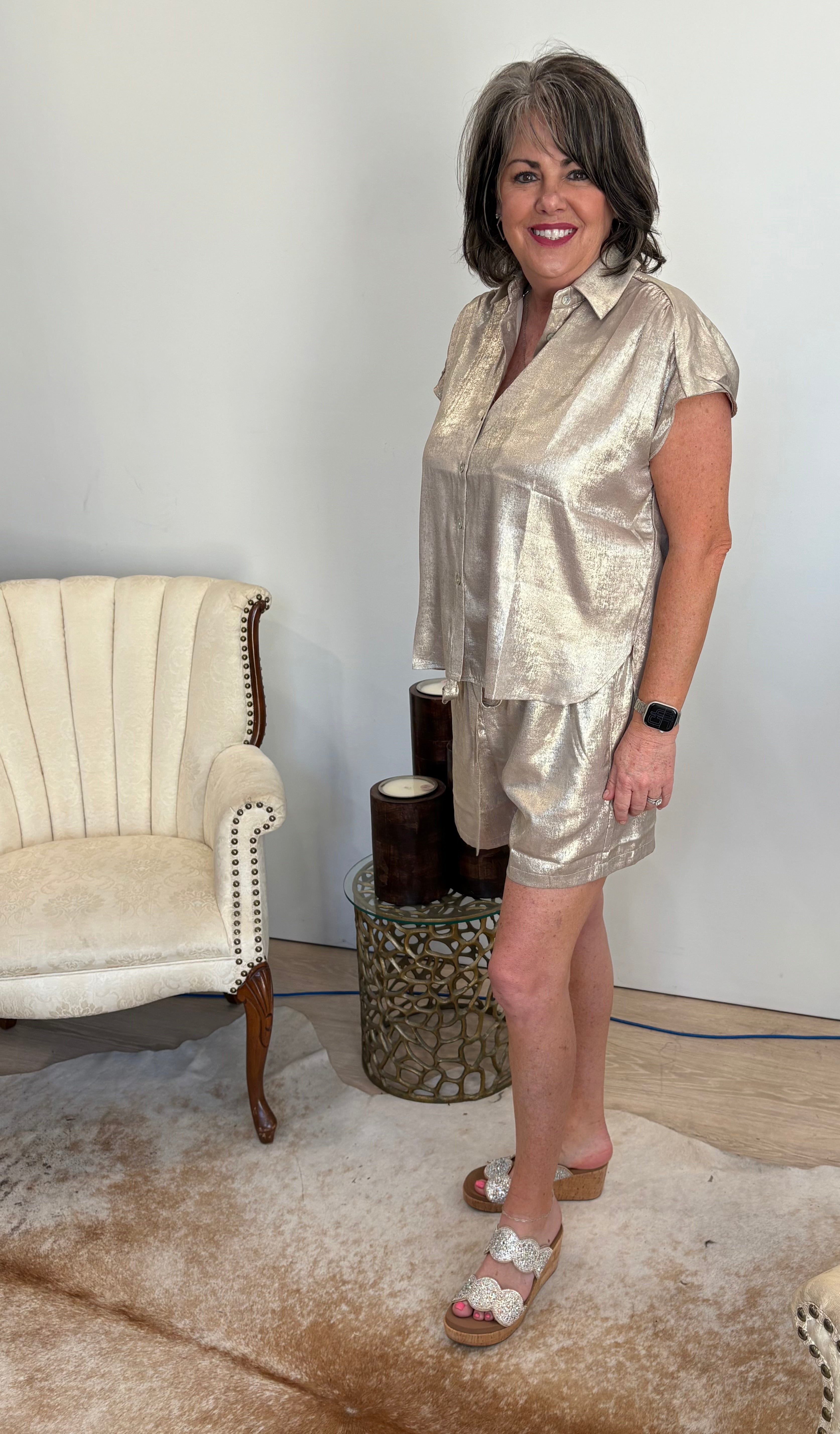 Get ready to shimmer and shine in this metallic top! Featuring an open collared neck and half dolman sleeves, this top is perfect for any occasion. The stretch-band cuffs ensure a comfortable and secure fit, while the non-sheer, lightweight fabric keeps you looking cool and collected.
