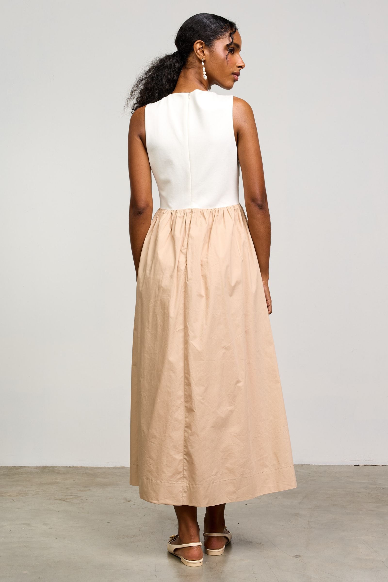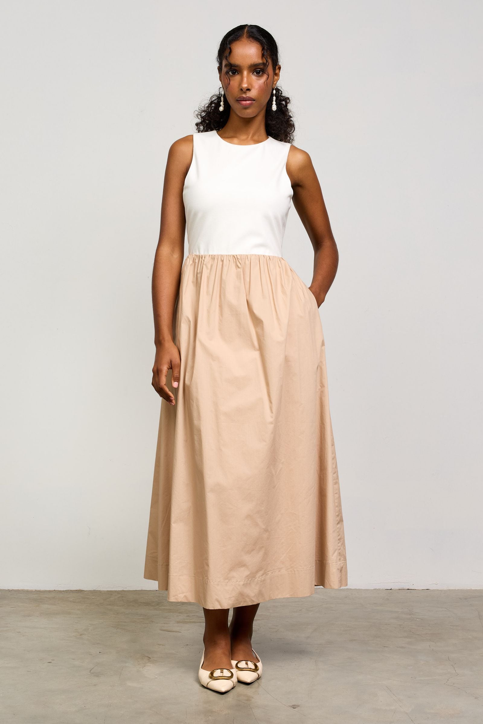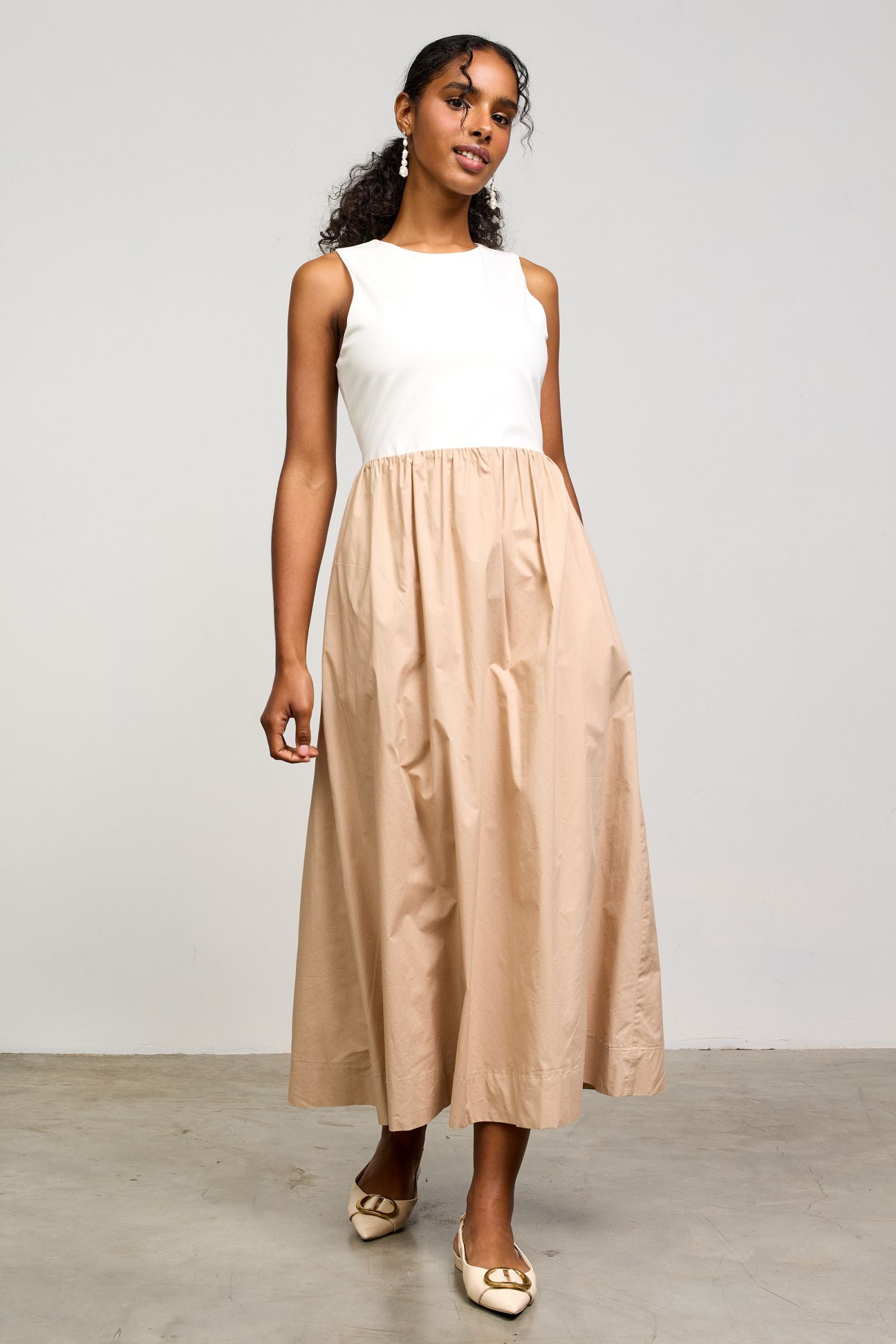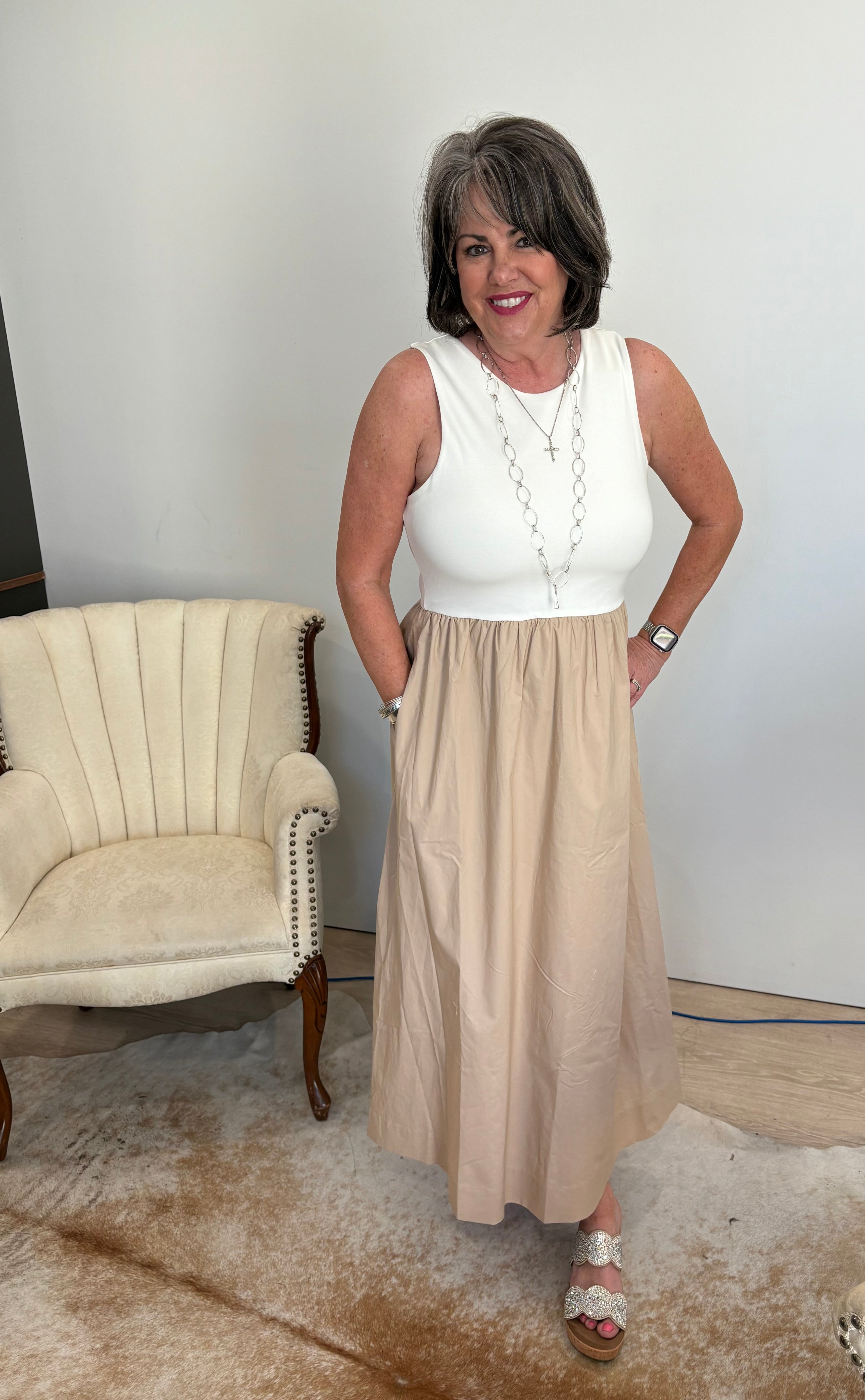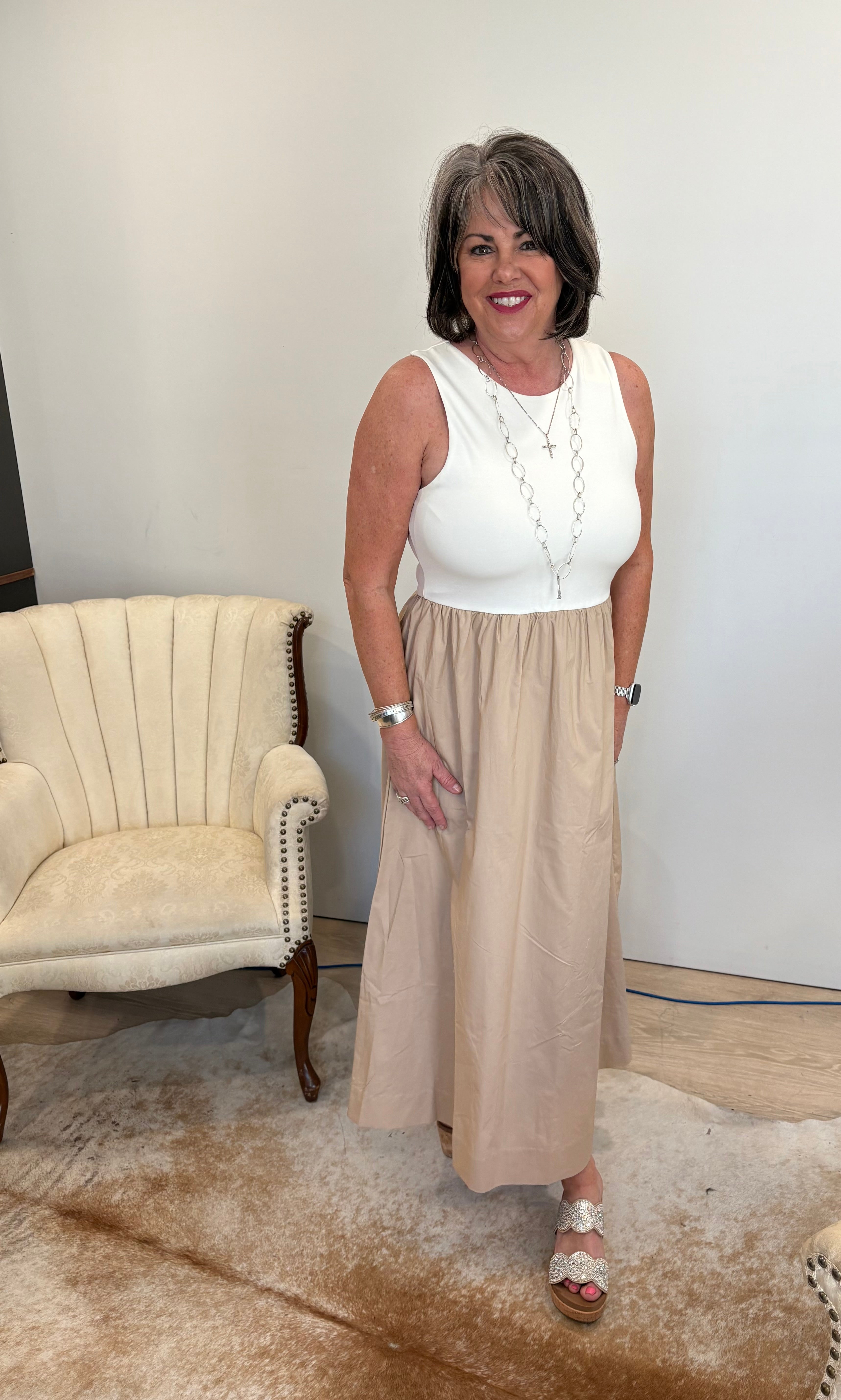 - MIXED MEDIA TANK MIDI DRESS"Get the best of both worlds with our Mixed Media Tank Midi Dress! Crafted with a unique blend of 60% rayon, 35% nylon, and 5% spandex, this dress offers both comfort and style. The white top adds a touch of elegance, while the tan bottom adds a playful twist. Perfect for any occasion!"