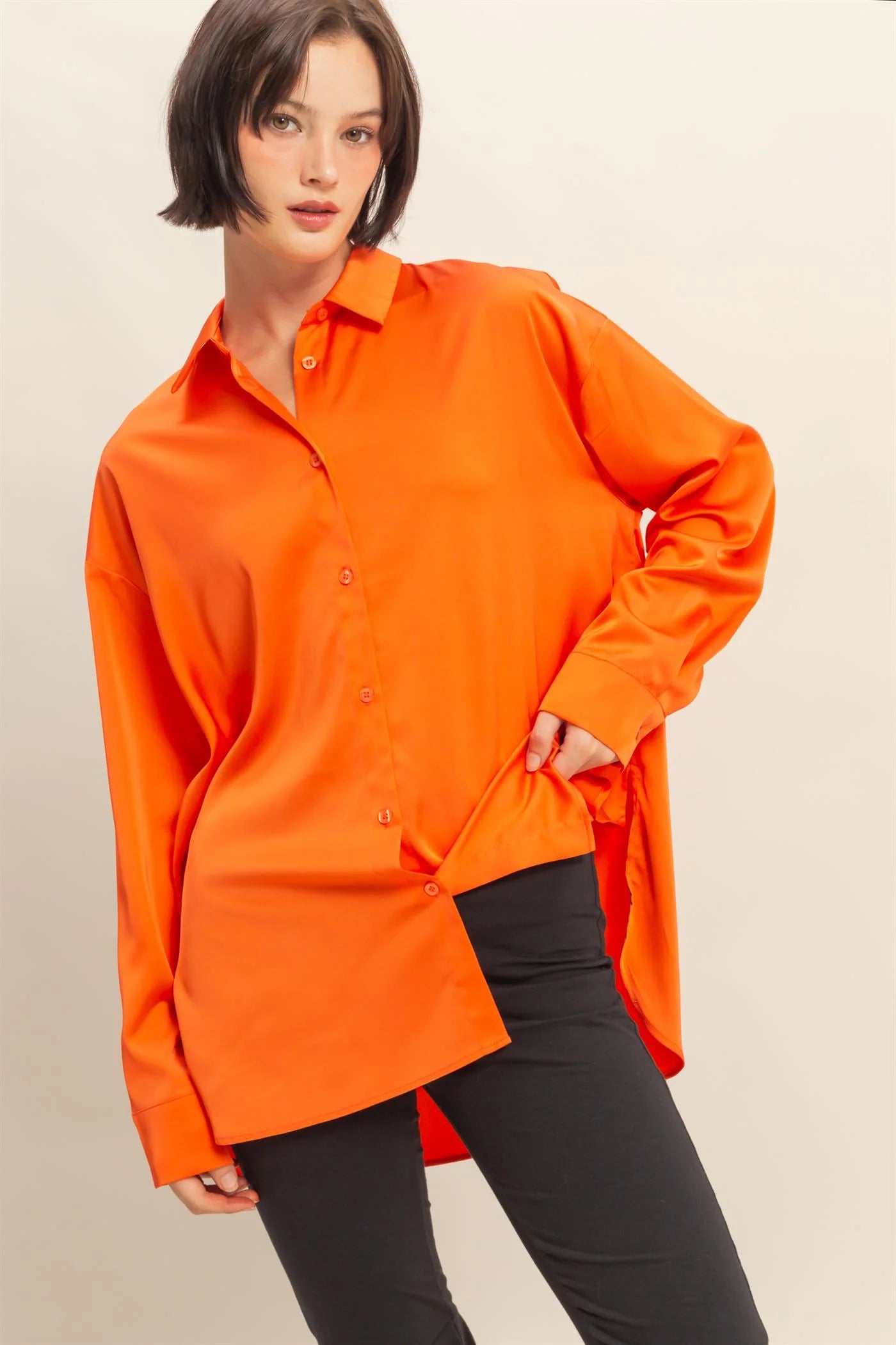 Elevate your look effortlessly with this luxe satin shirt. Featuring a crisp collared neckline and long sleeves finished with cuffed hems, it delivers a sleek, straight silhouette. The button-up front adds a touch of classic charm, making it the perfect go-to for a polished yet playful vibe.
