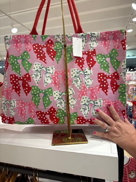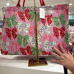 Make carrying all your essentials a breeze with this extra-large canvas tote. Its playful pink base is adorned with vibrant green, red, and white bows, adding a fun pop of color to your day. Spacious and sturdy, it's perfect for those who love style and practicality in one cheerful package.