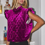 Elevate your wardrobe with this show-stopping quilted velvet vest that's equal parts cozy and chic! The flutter ruffle sleeves add a whimsical touch that catches every eye, while the quilted velvet fabric delivers luxe texture and warmth. Contrast lining peeks out for an unexpected pop of personality. Perfect for layering over your favorite tees or dresses, this versatile piece transforms any outfit from ordinary to absolutely fabulous. Embrace your bold side!