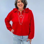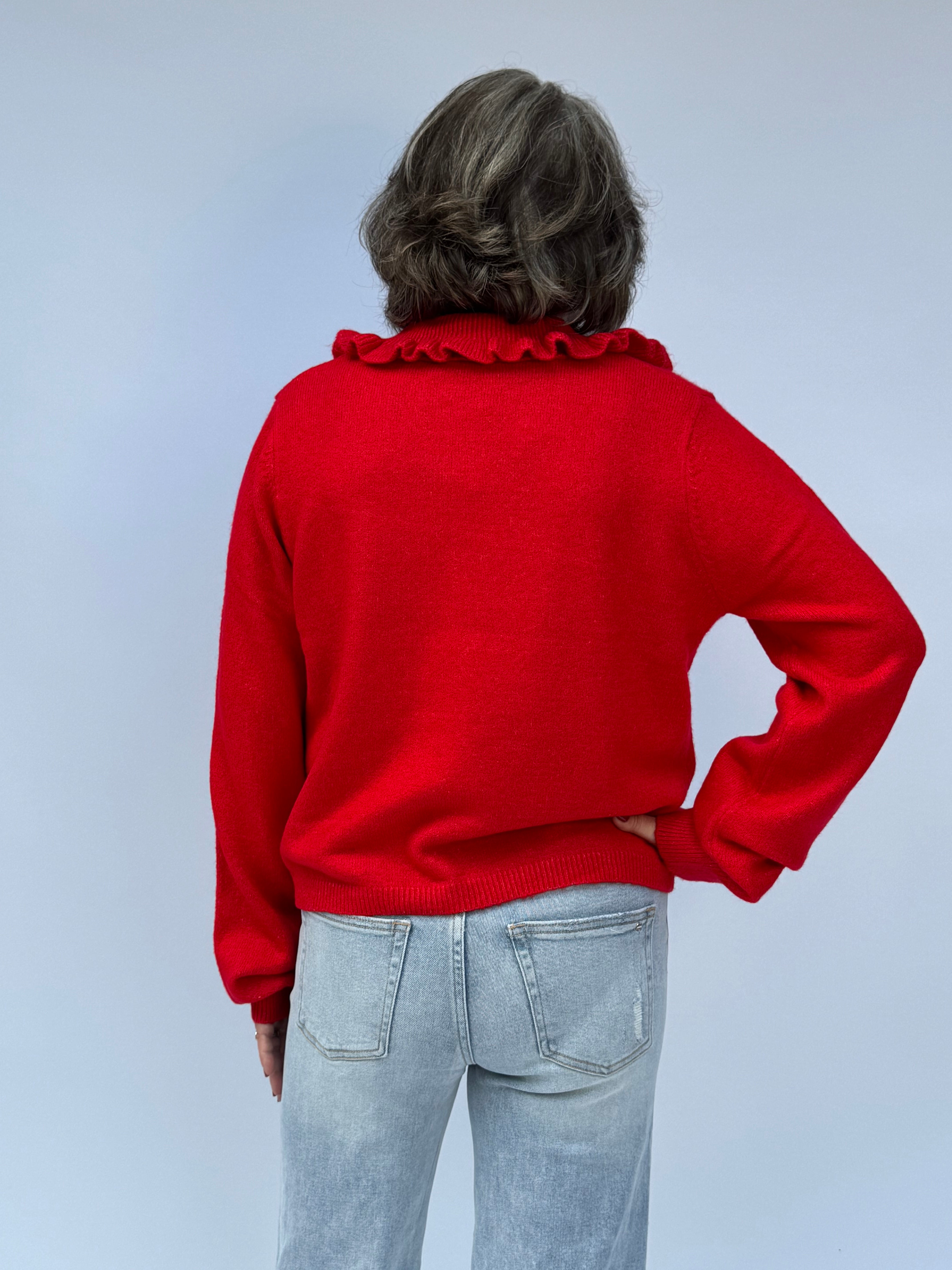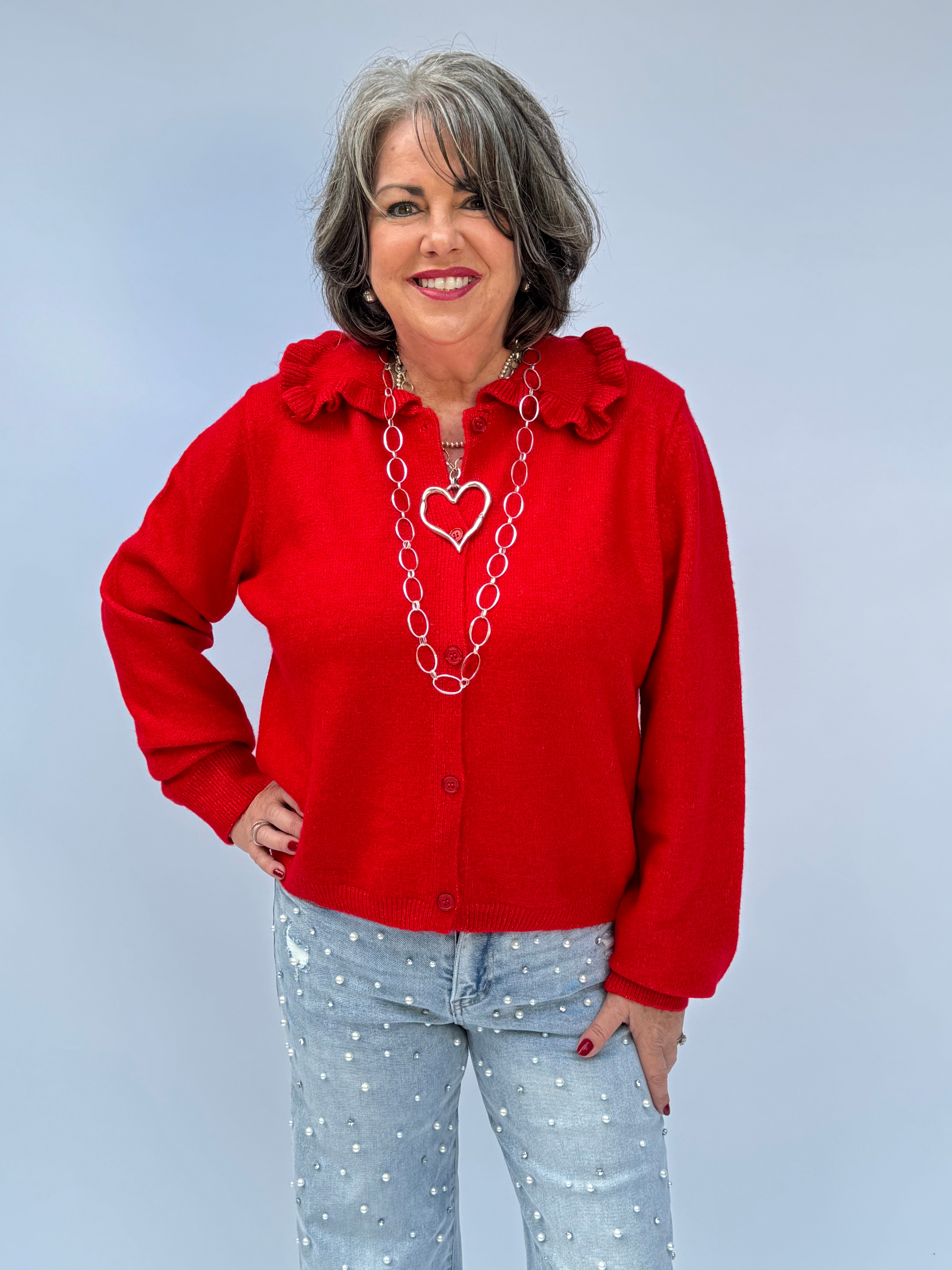 Cozy up in style with this charming cardigan sweater! Featuring a playful ruffle collar and delicate frill detailing along the neckline, it adds a touch of whimsy to your outfit. Perfect for layering over your favorite dress or pairing with denim, this sweater brings warmth and nostalgic flair to chilly days. Embrace comfort with flair!