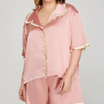 Slip into cozy elegance with this Contrast Ruffle Hem Half Sleeve Button Down Top and Shorts Satin Pajama Set. The playful ruffle hem adds a flirty twist, while the smooth satin fabric keeps you feeling luxuriously soft all night. Button down the top for easy style and pair with matching shorts for a perfect blend of comfort and charm, making bedtime your new favorite runway.