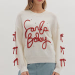 Cozy up in the Santa Baby Sweater, where festive fun meets charming details. This round neck, long sleeve knit sweater features playful letter trimming that adds a cheeky twist, while adorable bow appliqués along the sleeves bring a touch of whimsy. Perfect for spreading holiday cheer with style and comfort.