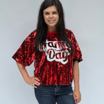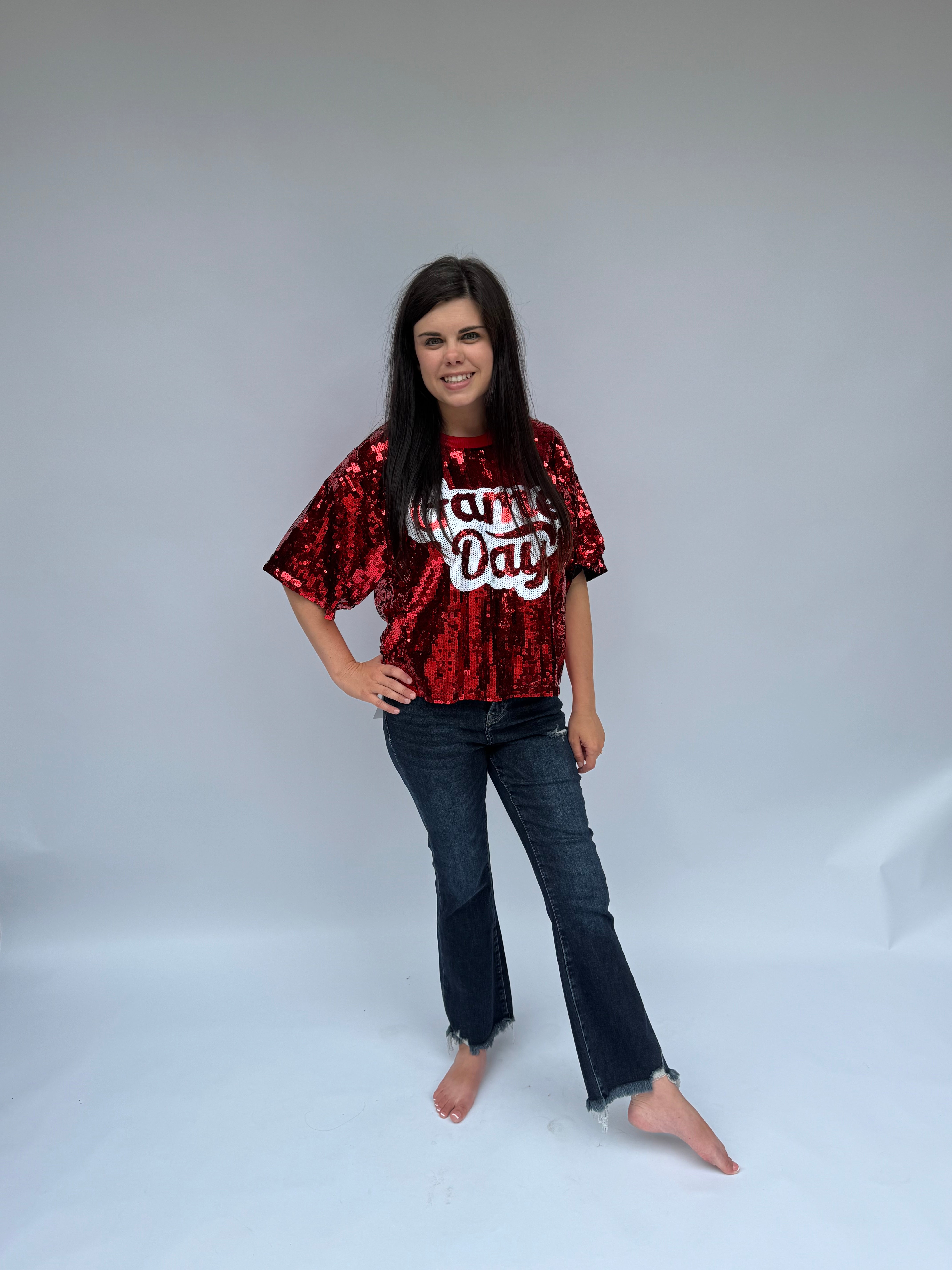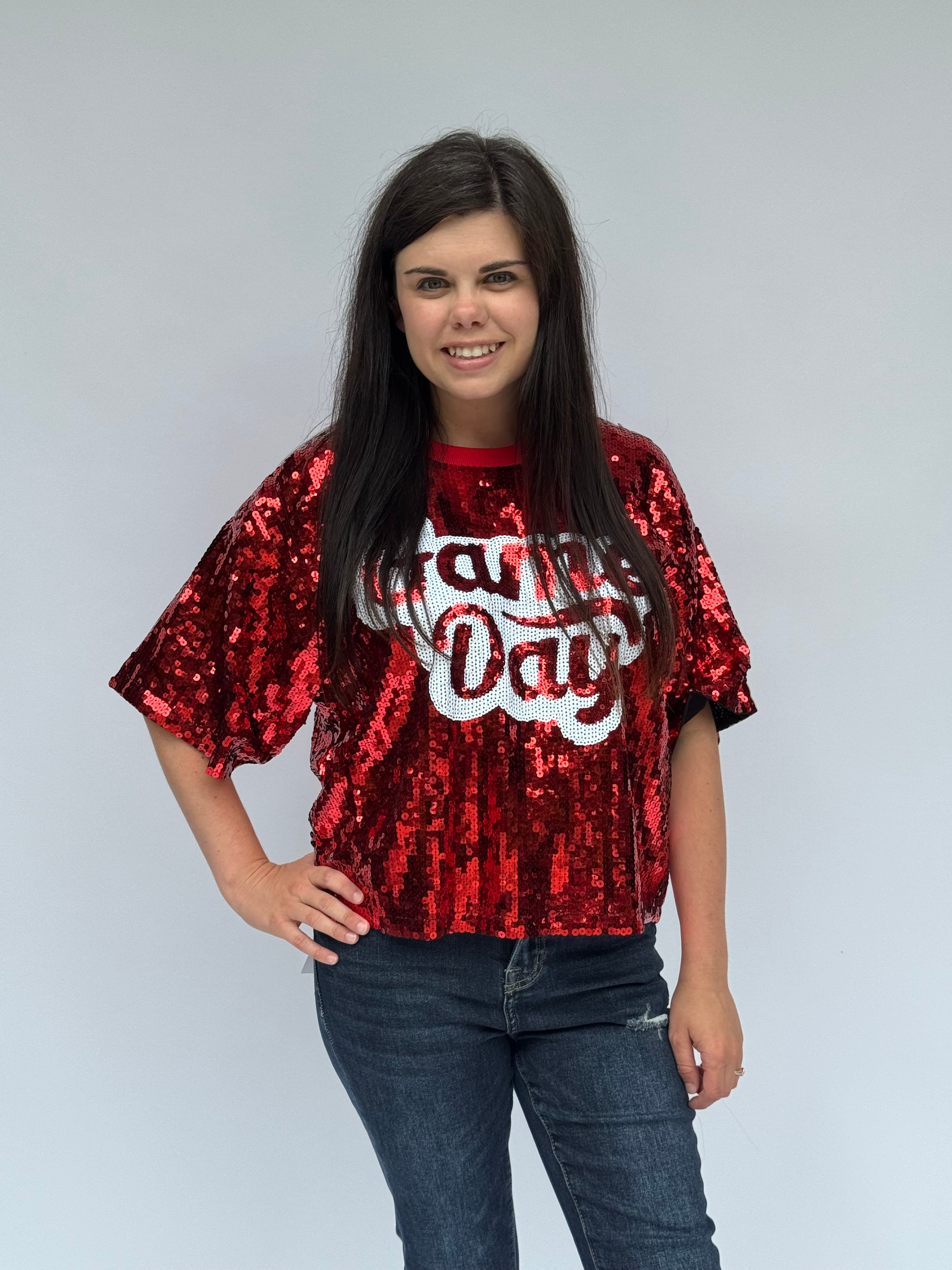 Get ready to sparkle and stand out on game day with our Sequin Game Day Top! This short sleeve top features bold lettering in shimmering sequins, perfect for catching the spotlight. Show off your team spirit and your fashion sense with this statement piece.