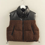 Stay cozy and turn heads in this playful puffer vest, blending sleek PU with soft sherpa for irresistible texture. Its oversized collar and side slit pockets add flair while keeping you warm. Perfect for layering in style with a front zipper that’s both practical and chic.