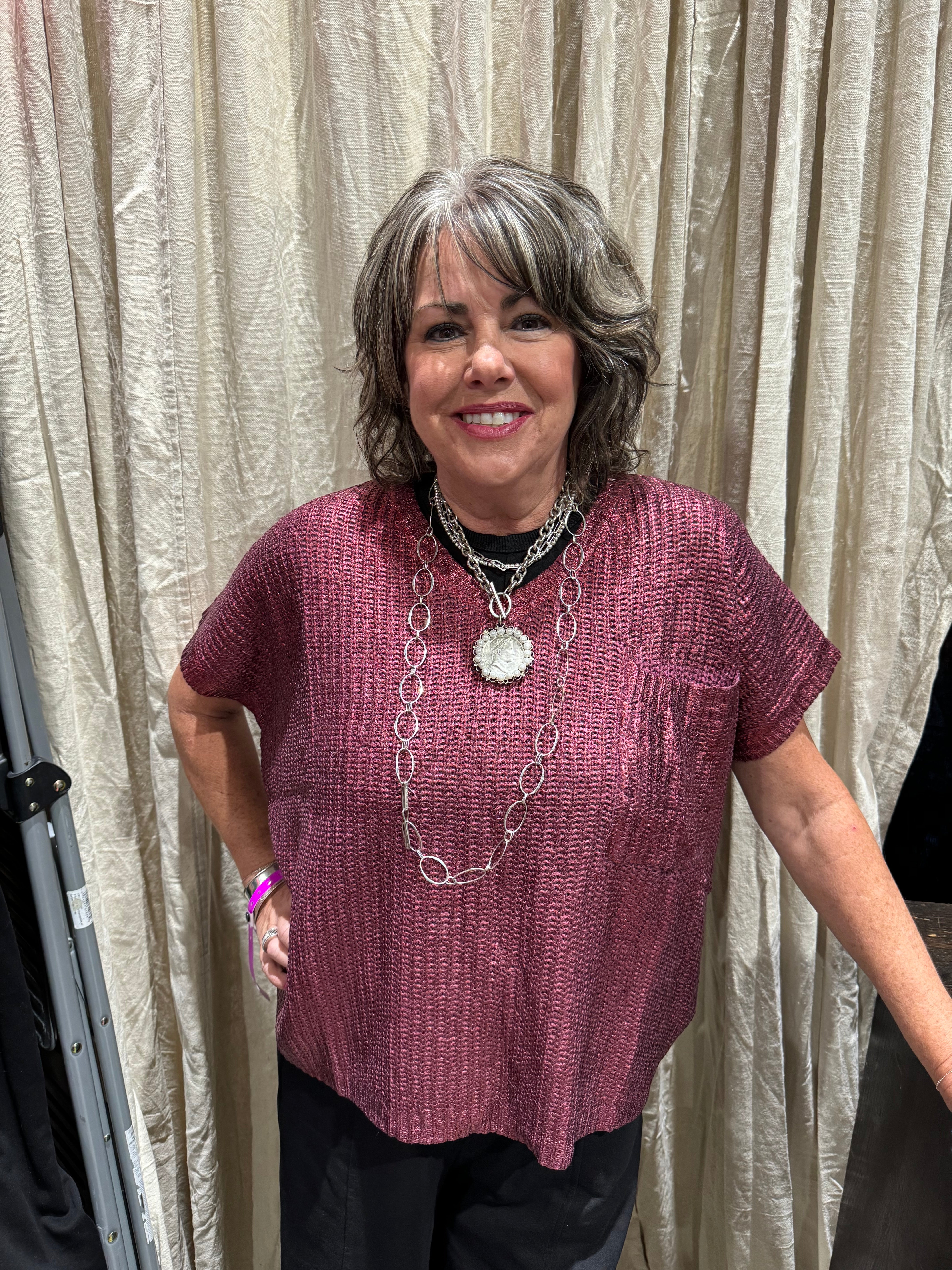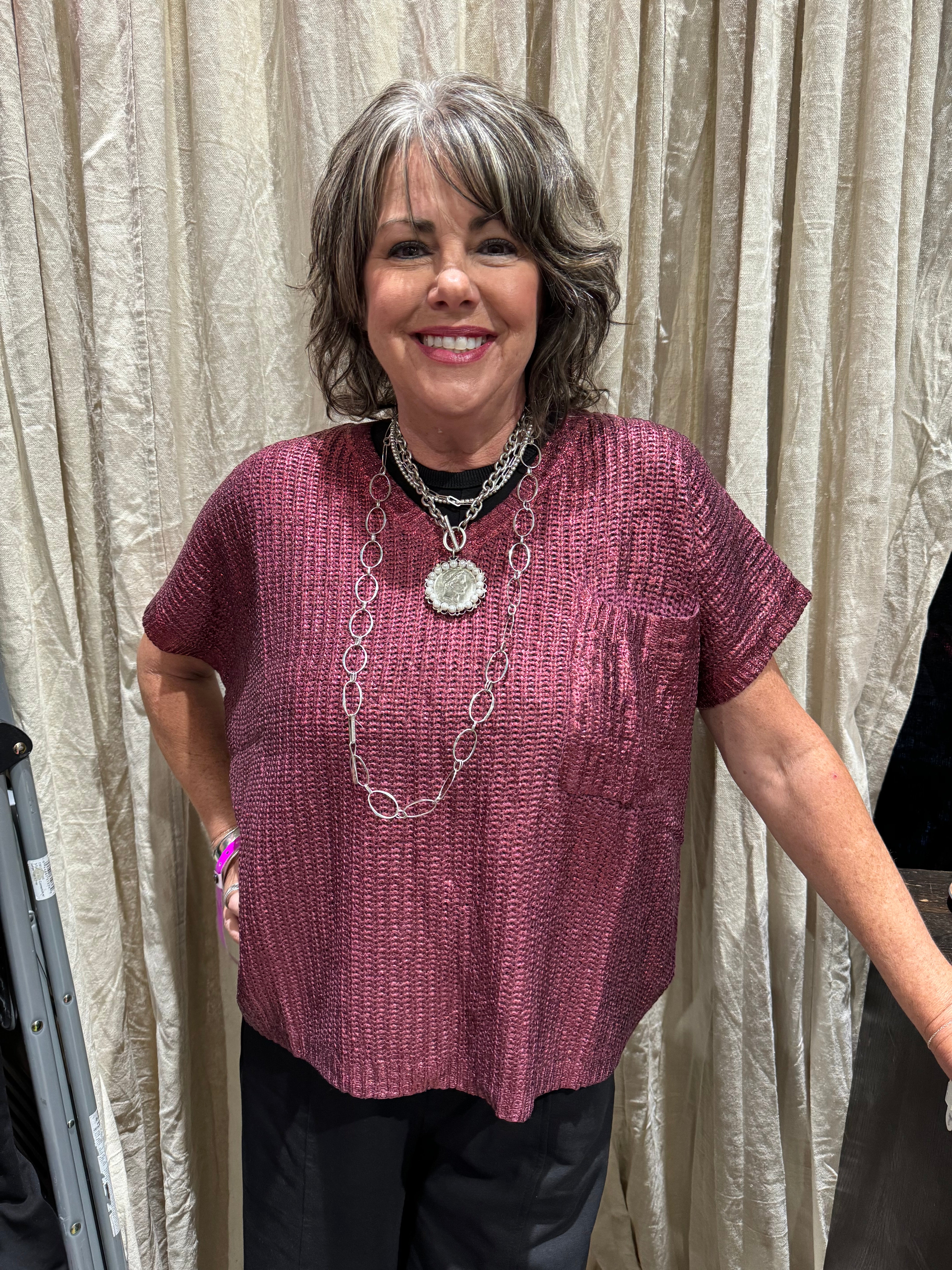 Introducing our luxurious metallic coated sweater top, featuring a flattering V neck and convenient front pocket. Made of a soft blend of viscose and nylon, this short sleeve top is both stylish and comfortable. Upgrade your wardrobe with this exclusive and sophisticated piece.