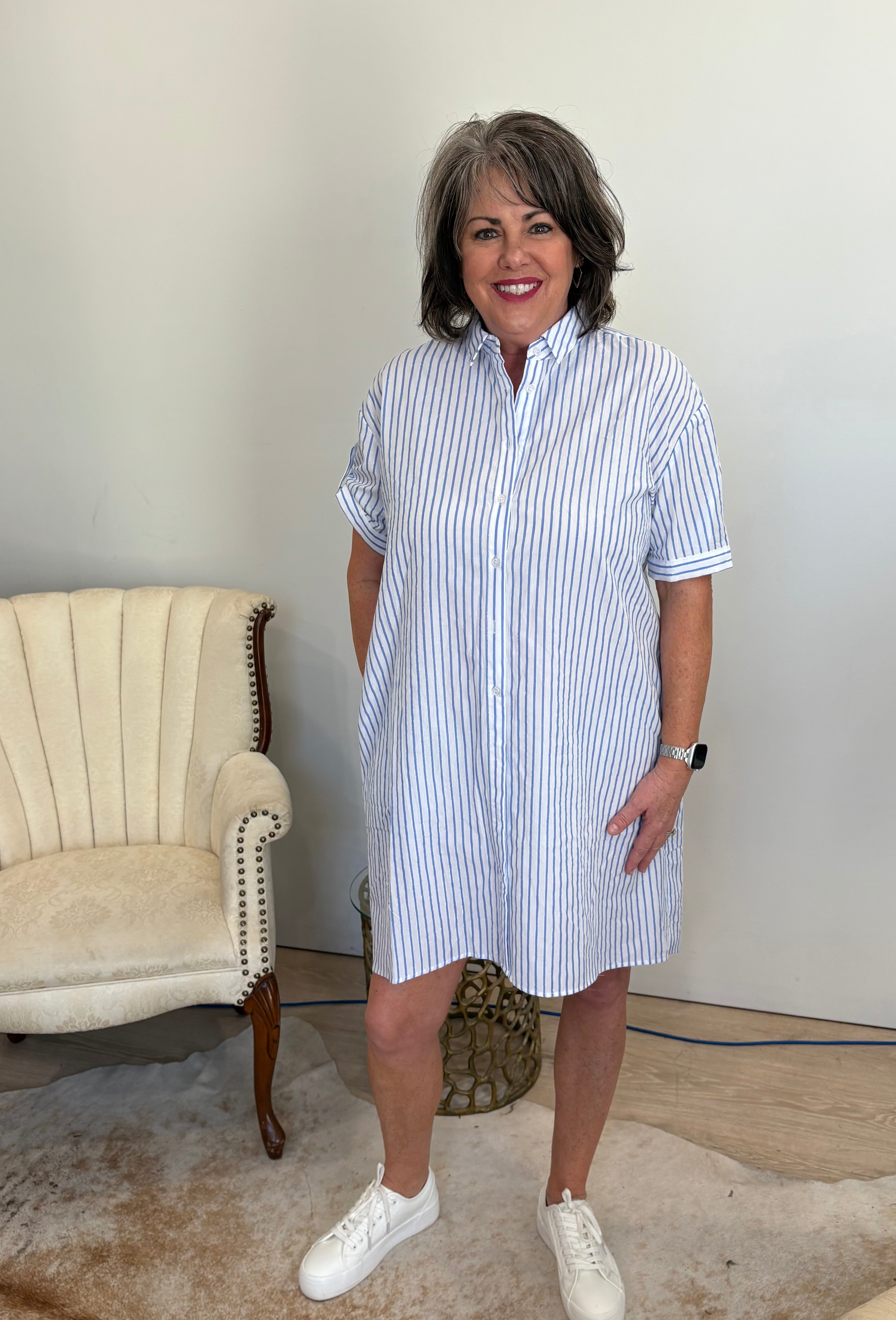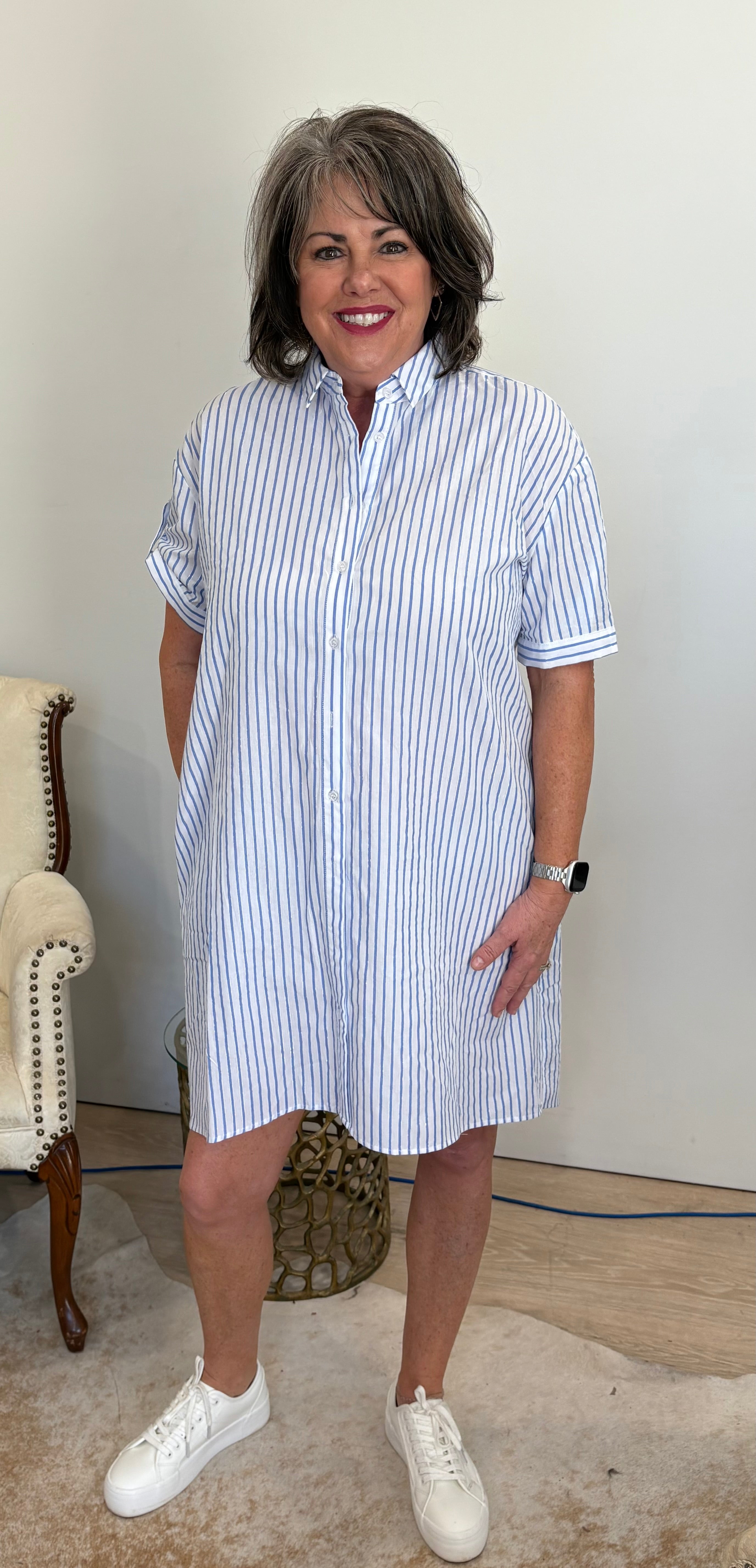 Unleash your bold and adventurous side with this versatile collared shirt/dress! Perfect for taking risks, it features a button up design, knee length dress with white and blue stripes, and a longer back for added style. Wear it with sandals or sneakers, and even leave it open for a unique shirt jacket look. A must-have for any daring wardrobe!