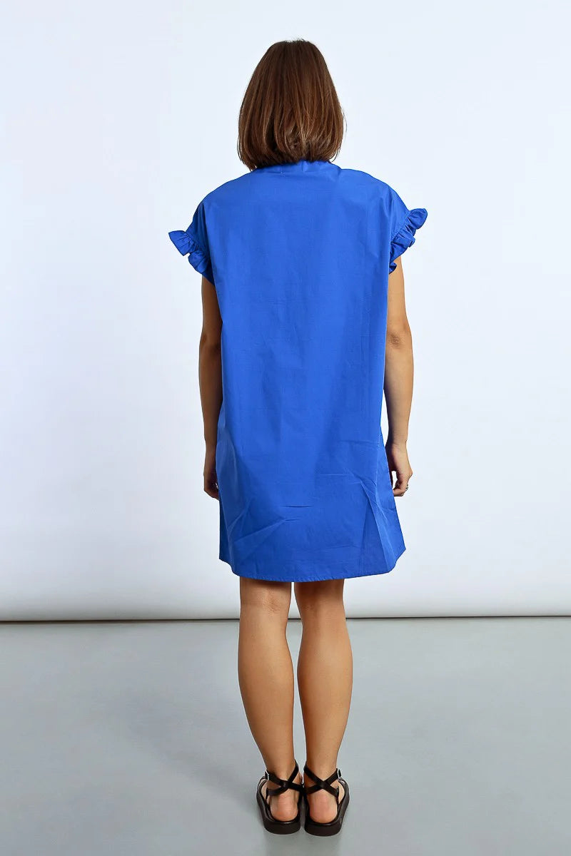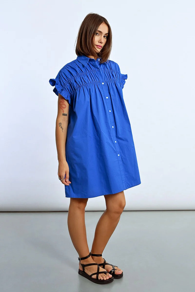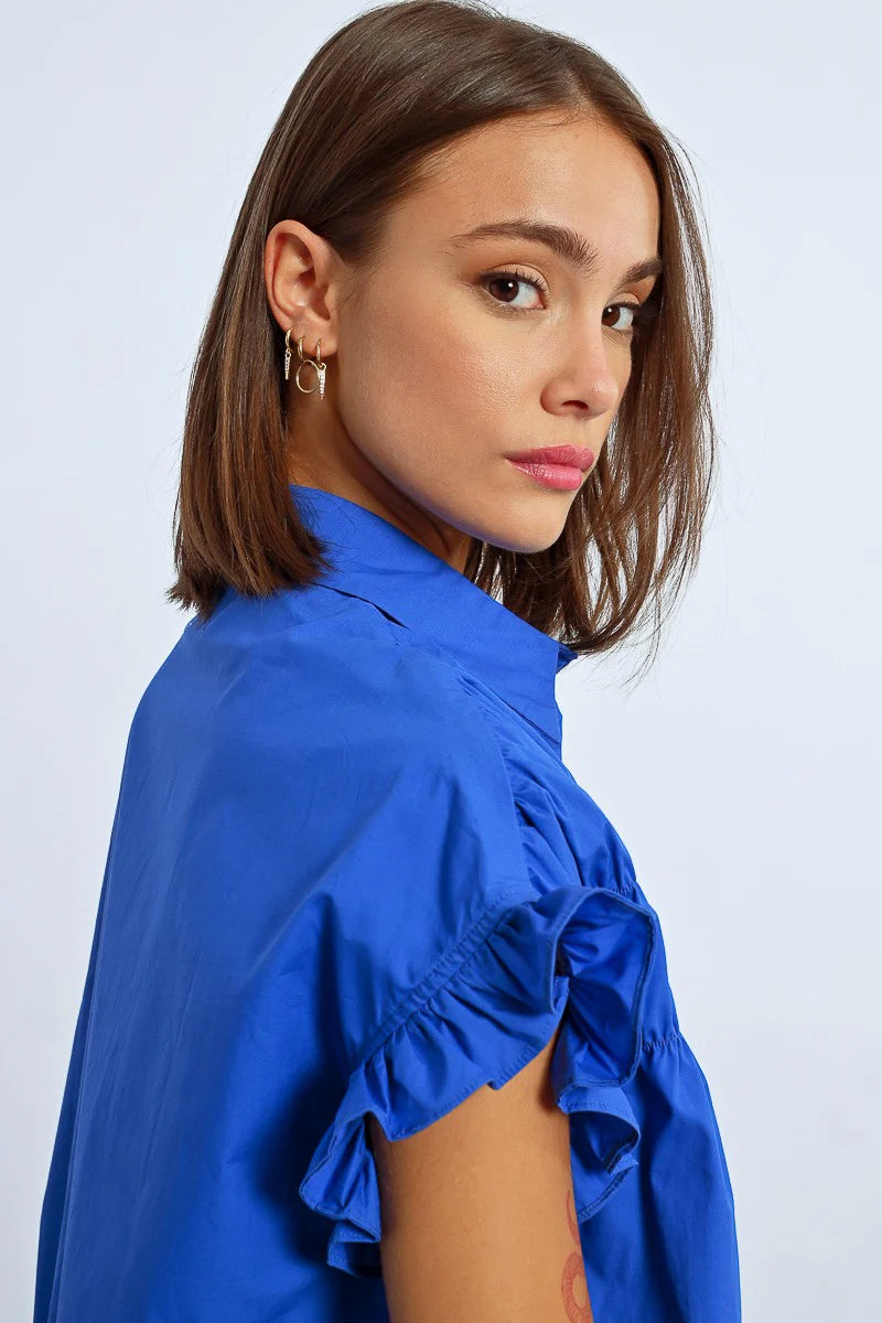 This ruffle-sleeved button up shirt is ready to be your new favorite. With a dress collar and just above the knee length, it's perfect for work or play. The short cap sleeves add a touch of fun, making this shirt anything but ordinary. Smock detail on the top adds a unique twist. (Grab it before it's gone!) the fit is oversized