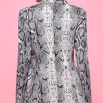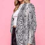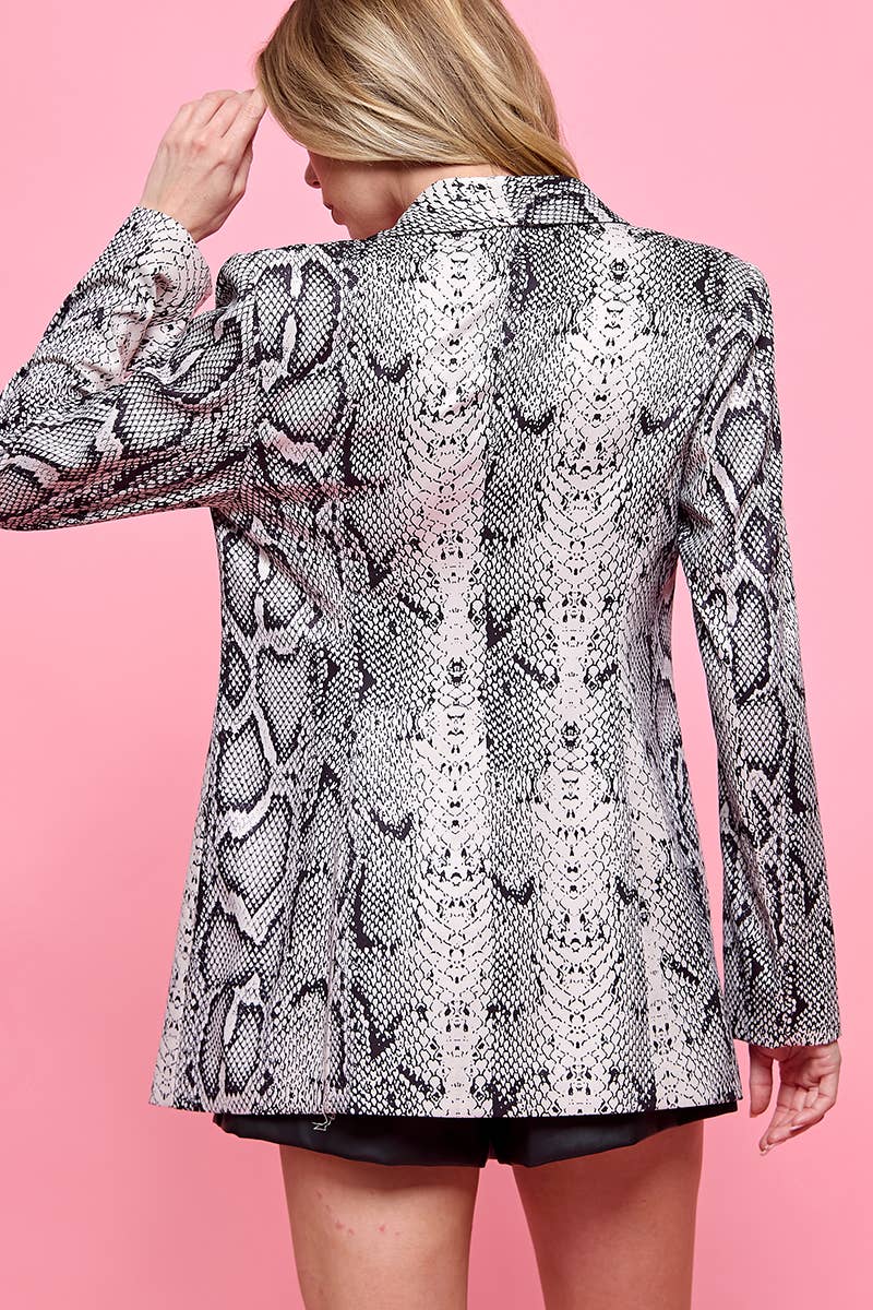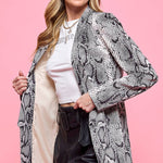 Elevate your style with this playful snakeskin suit coat blazer featuring bold shoulder pads and a sleek long lapel for a standout look. Crafted from a comfy blend of 65% polyester and 35% rayon, it combines black and cream tones in a chic pattern—no buttons needed to turn heads. Perfect for those who like a dash of daring with a polished twist!