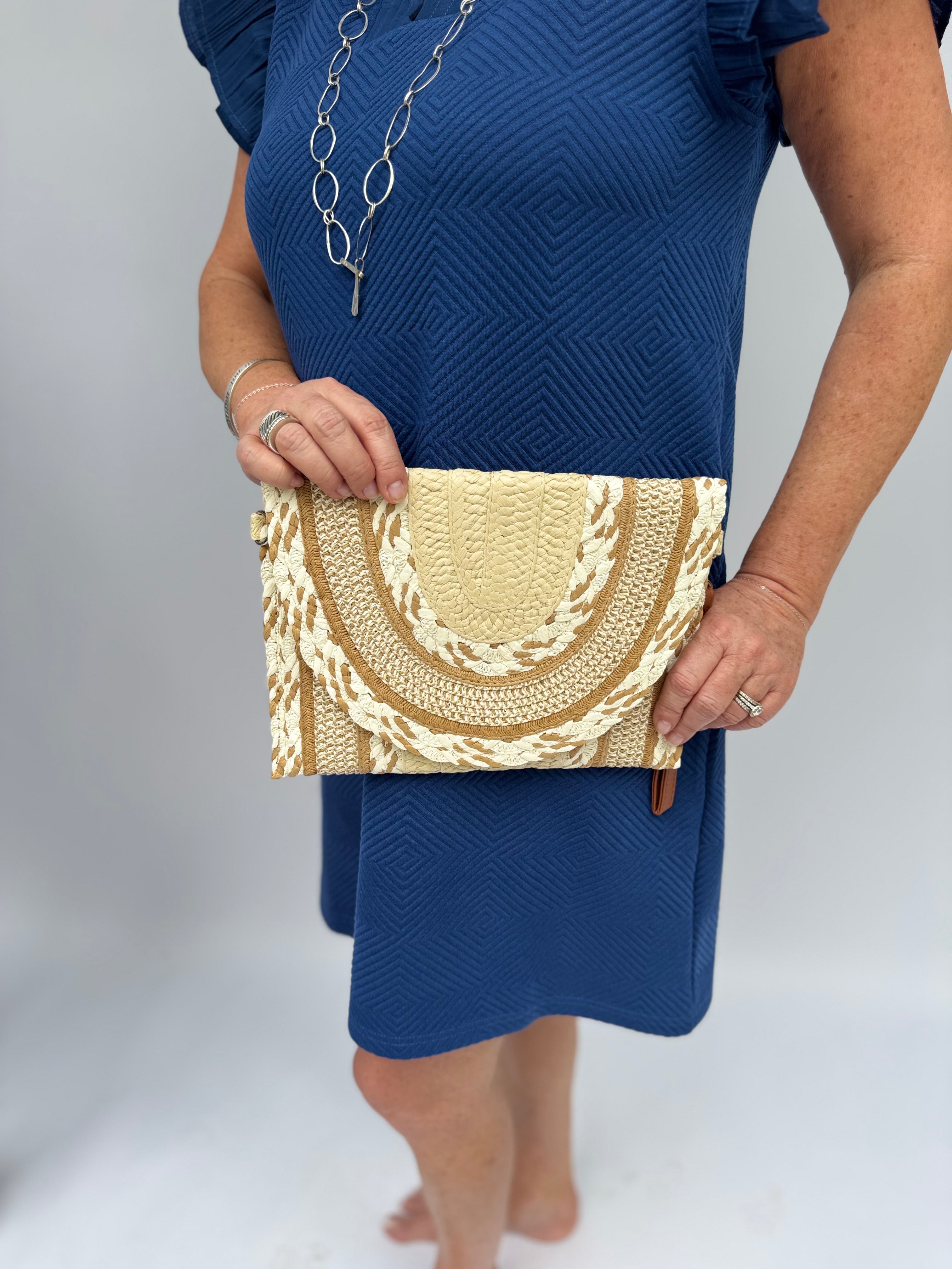 Get twisted in style with our tan and white braided woven clutch purse. Perfect for a night out or adding a unique touch to your everyday look. Carry your essentials with ease and show off your playful side!