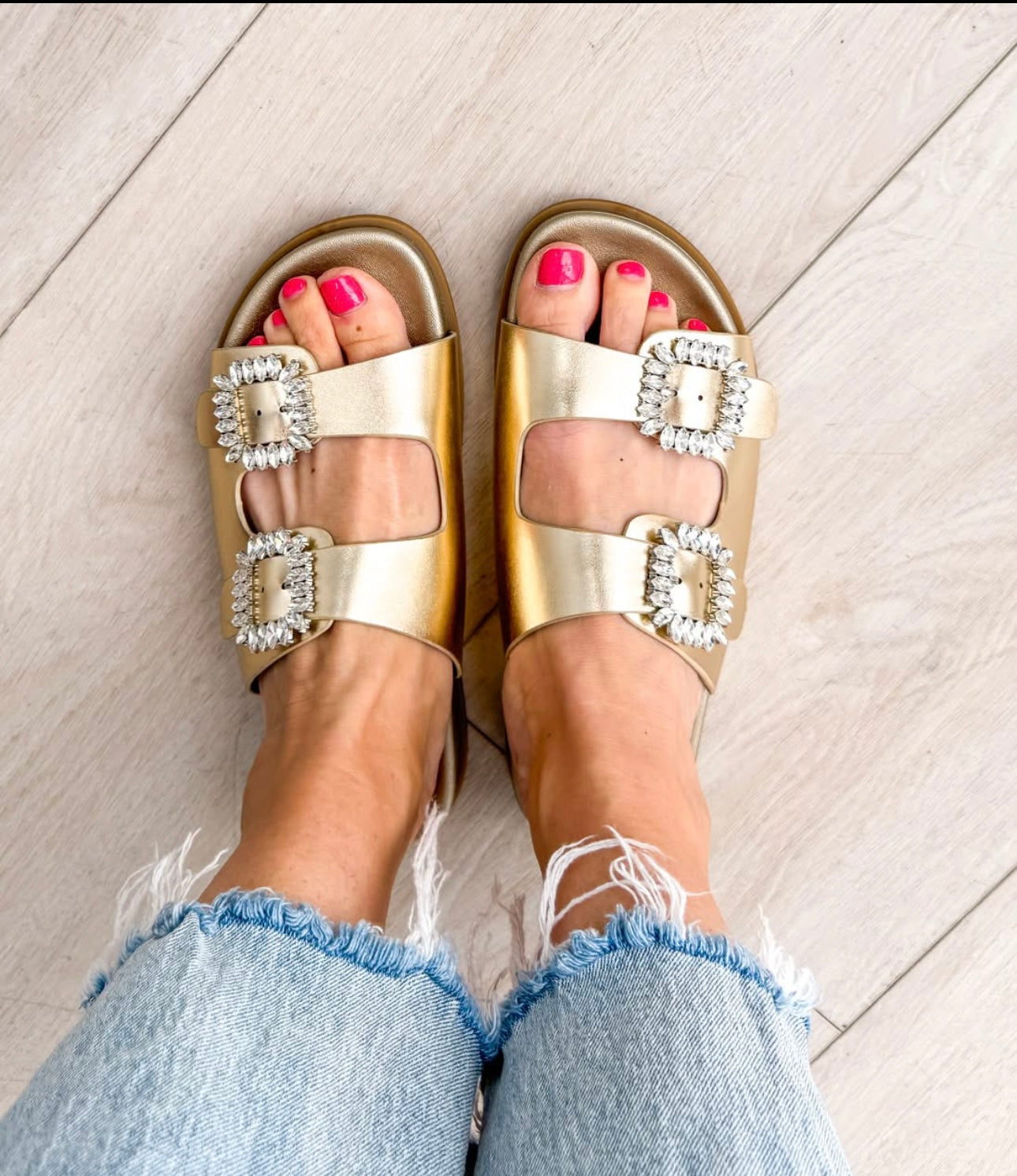 Step out in style with these trendy sandals featuring two top straps that are adjustable for the perfect fit. The bling buckles on each strap add a touch of sparkle and glamour to your look, making these sandals perfect for both casual and dressy occasions. Made in a slide style similar to other sought out brands, these metallic sandals are not only fashionable but also comfortable and supportive for all-day wear. Elevate your summer wardrobe with these chic and versatile sandals that are sure to turn heads wherever you go.