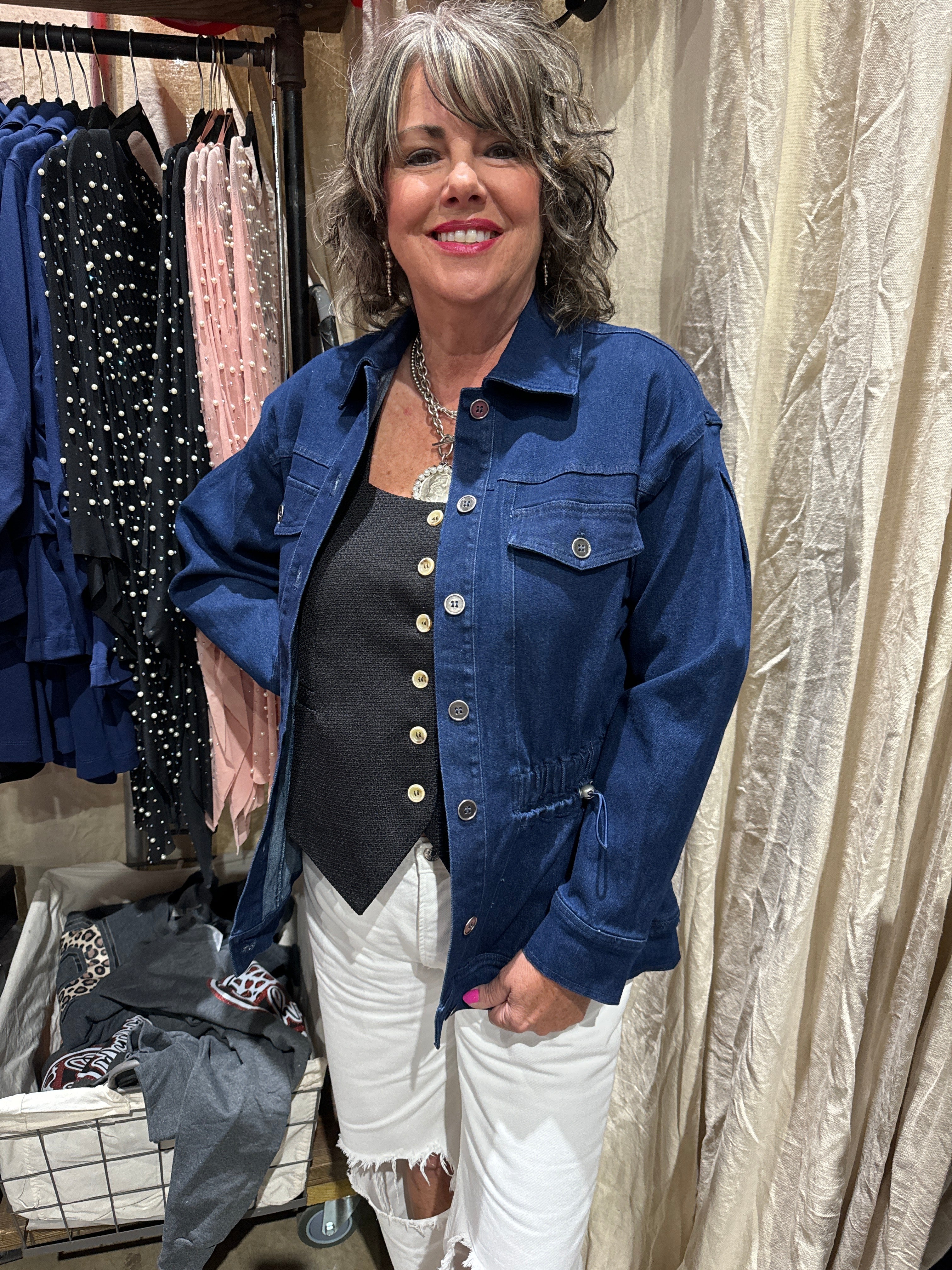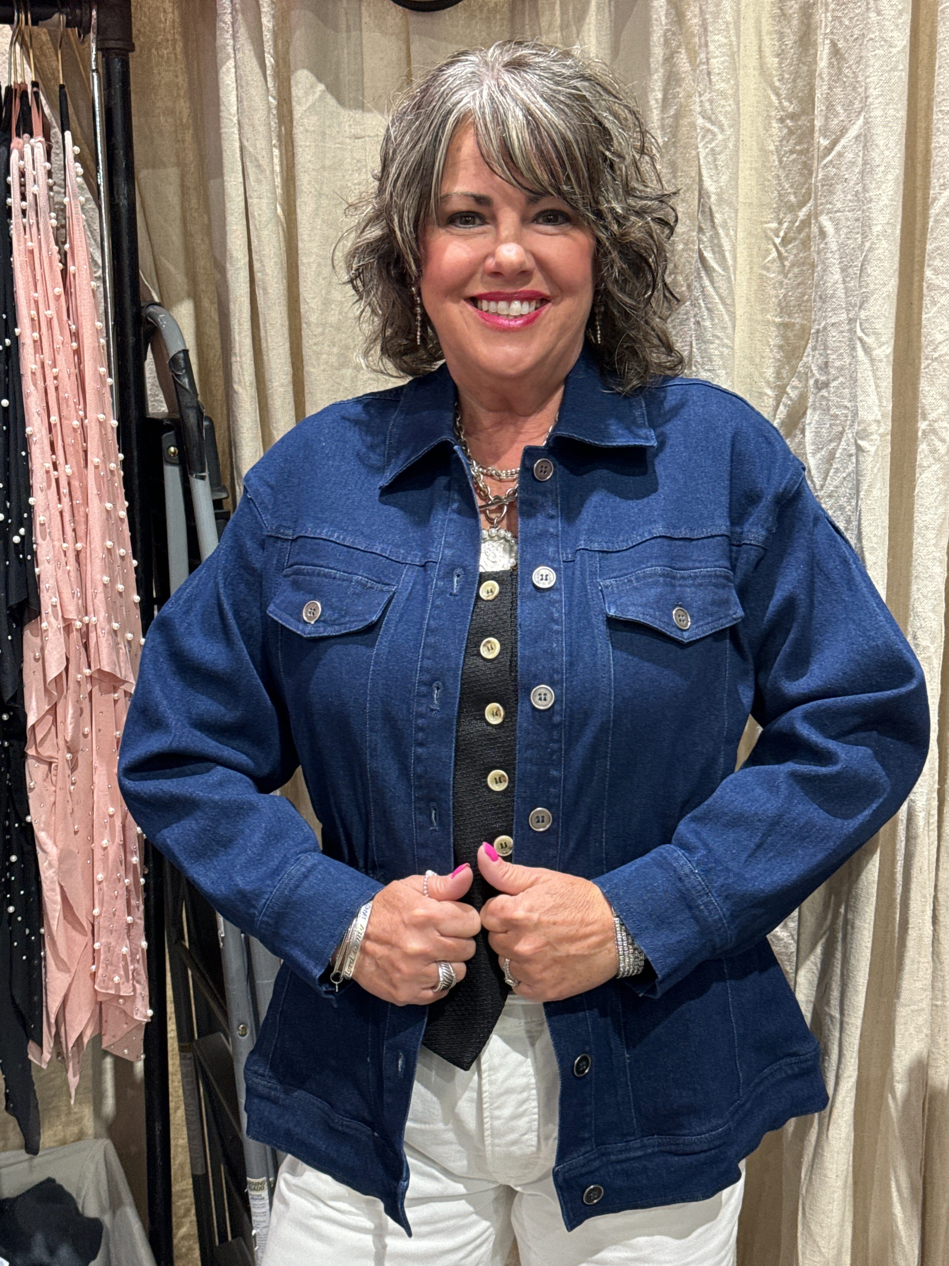 Upgrade your wardrobe with our Cinch Waist Denim Jacket. With two chic chest pockets, large silver buttons, and a stylish collar, this jacket is perfect for any occasion. Its spandex and cotton blend provides a comfortable fit while the yoke adds a touch of sophistication. Elevate your look with this elegant and exclusive piece.