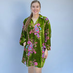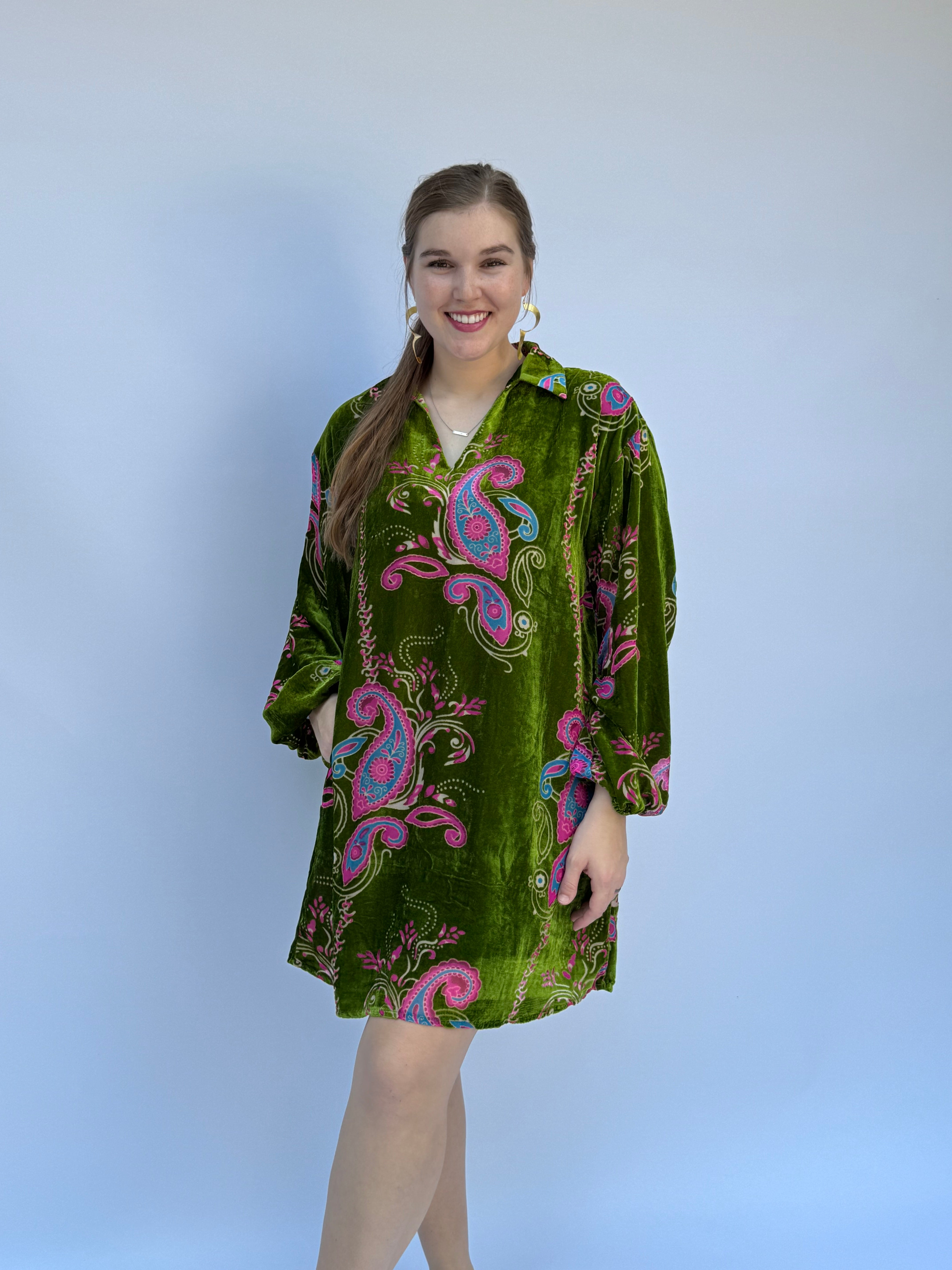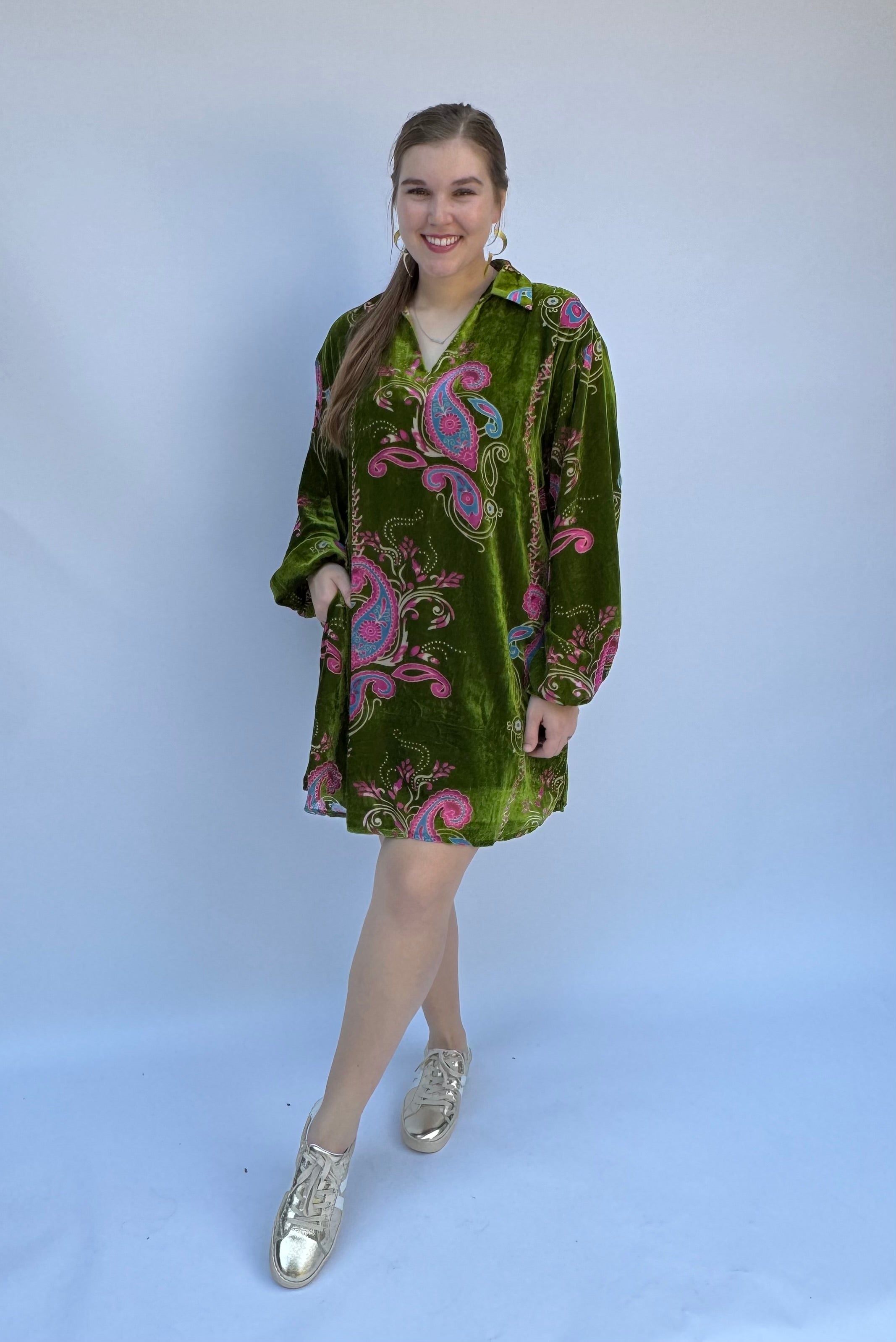 Embrace whimsy with this velvet dress featuring long puff sleeves and a lively paisley print. Its soft texture and playful silhouette offer comfort and style, while handy side pockets add a touch of practicality to your fun-loving look. Perfect for turning heads with effortless charm.