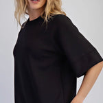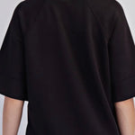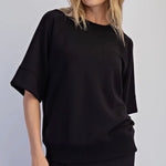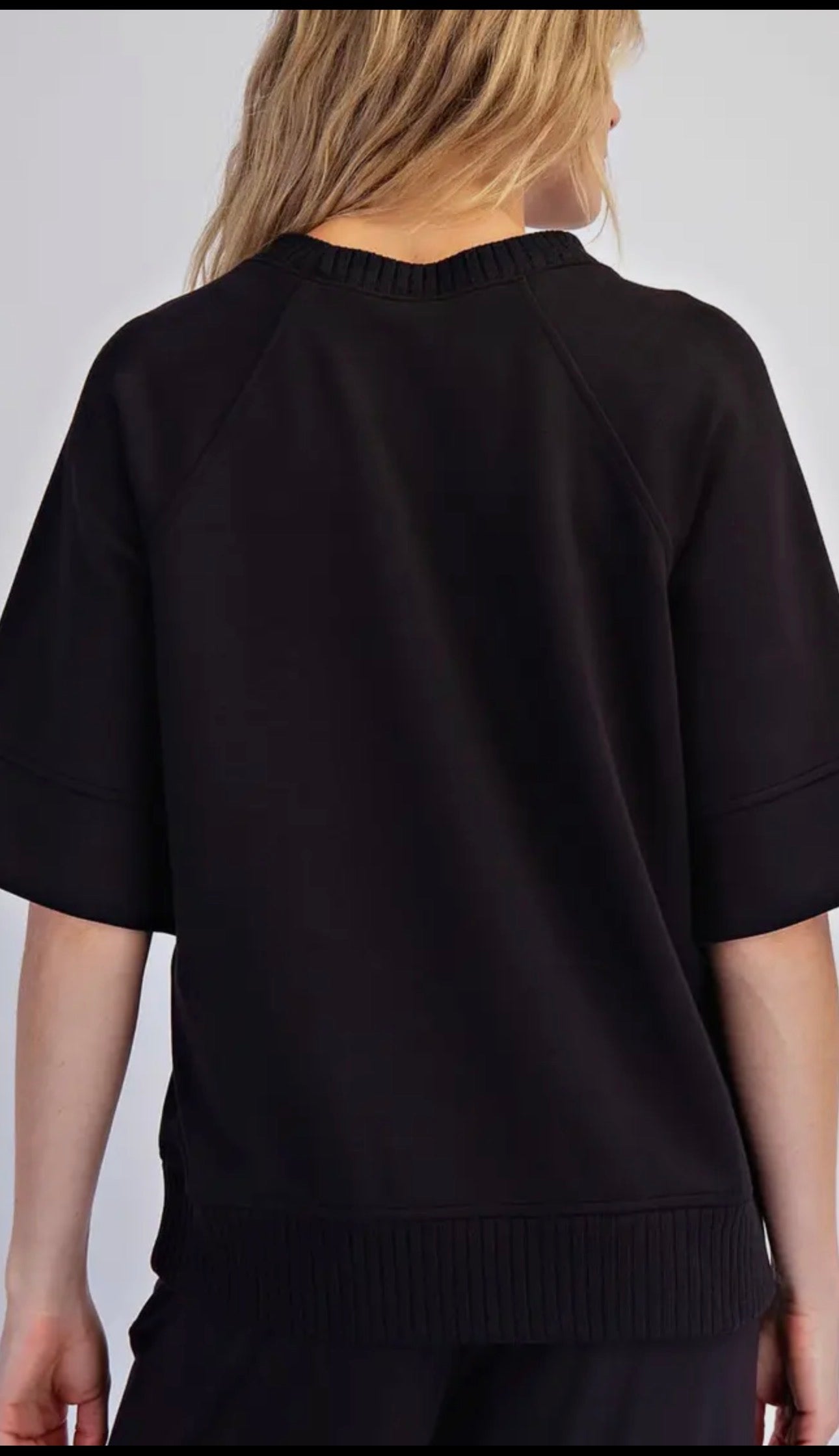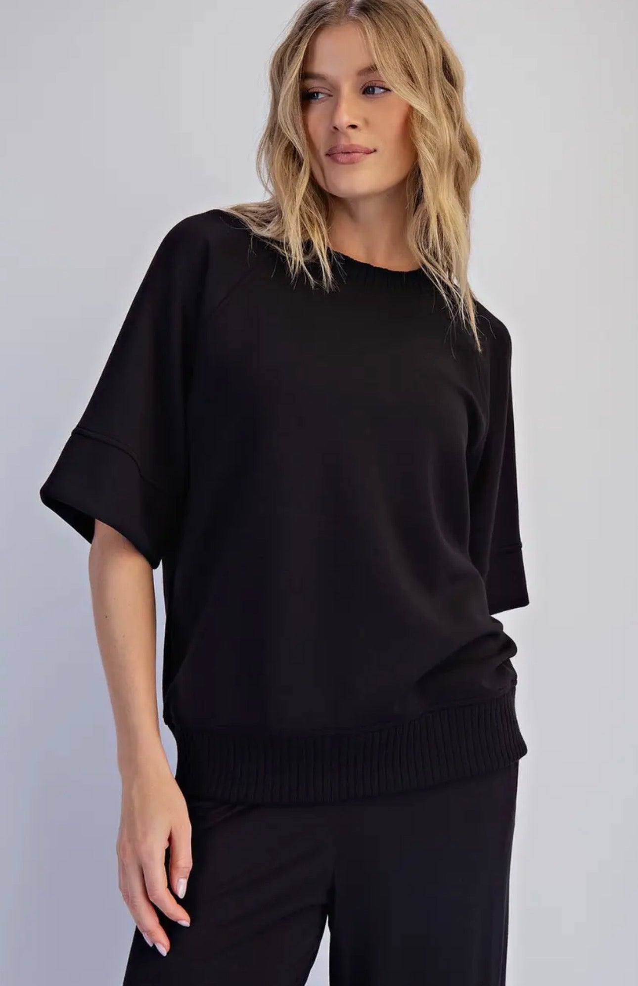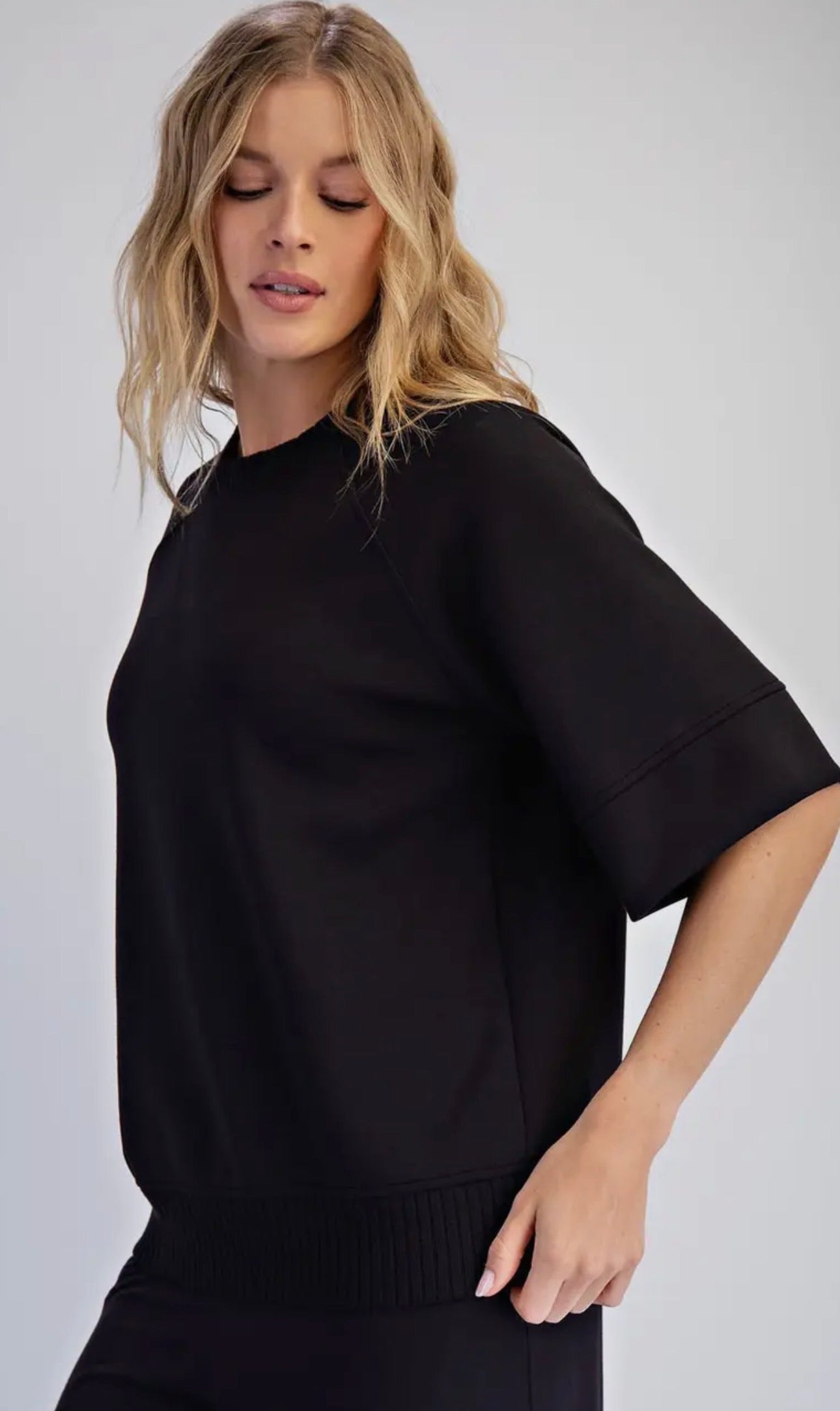 Meet your new favorite black top: it's like a cuddle for your torso! Crafted from silky smooth modal poly span scuba fabric, this short sleeve gem has a relaxed fit and oversized raglan sleeves for that "I just threw this on, but I look fabulous" vibe. Those 4x2 ribbed accents? Just the right amount of pizzazz! Transition effortlessly from brunch to lazy day